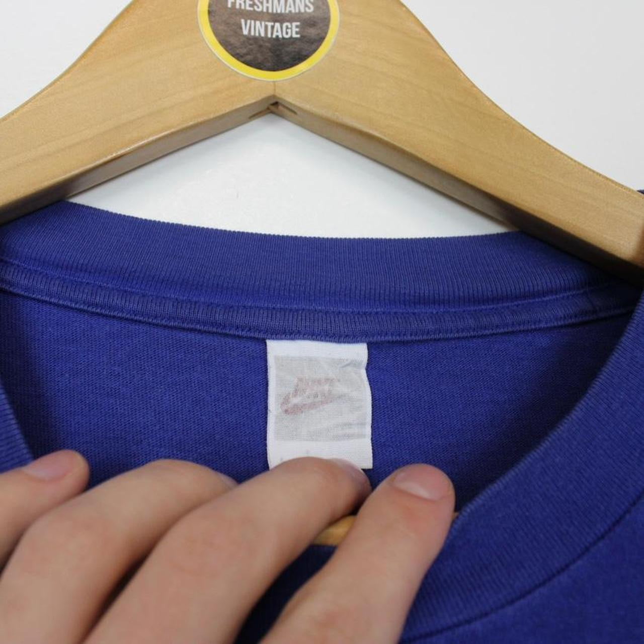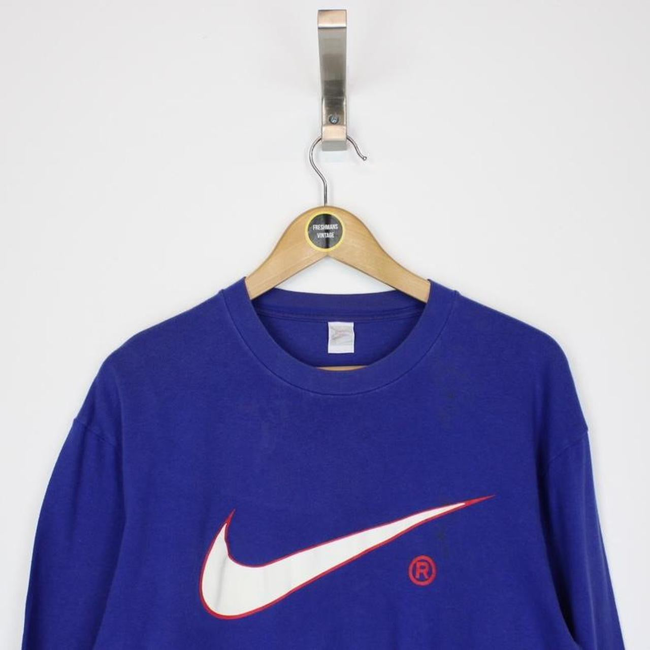 Vintage 90s Nike Blue and White Crew Neck Long Sleeve Centre Swoosh T-Shirt Size on label: Large Our recommended size: Medium Pit to pit (inches): 20.5 Length (inches): 26 All products listed are vintage unless stated otherwise in the description. These items are pre-loved and pre-worn, resulting in small signs of wear and fading. We think this adds to their unique authenticity, but if an item has any major flaws these will be stated. - The t-shirt has a pinhole to the left shoulder, a few light marks throughout and also some shredding to the collar, this is reflected in the price Please contact us if you have any further questions!