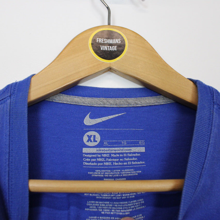 Vintage 00's Nike Blue and White Short Sleeve Spellout T-Shirt Size on label: XL Our recommended size: Small Pit to pit (inches): 18.5 Length (inches): 25 All products listed are vintage unless stated otherwise in the description. These items are pre-loved and pre-worn, resulting in small signs of wear and fading. We think this adds to their unique authenticity, but if an item has any major flaws these will be stated. Please contact us if you have any further questions!