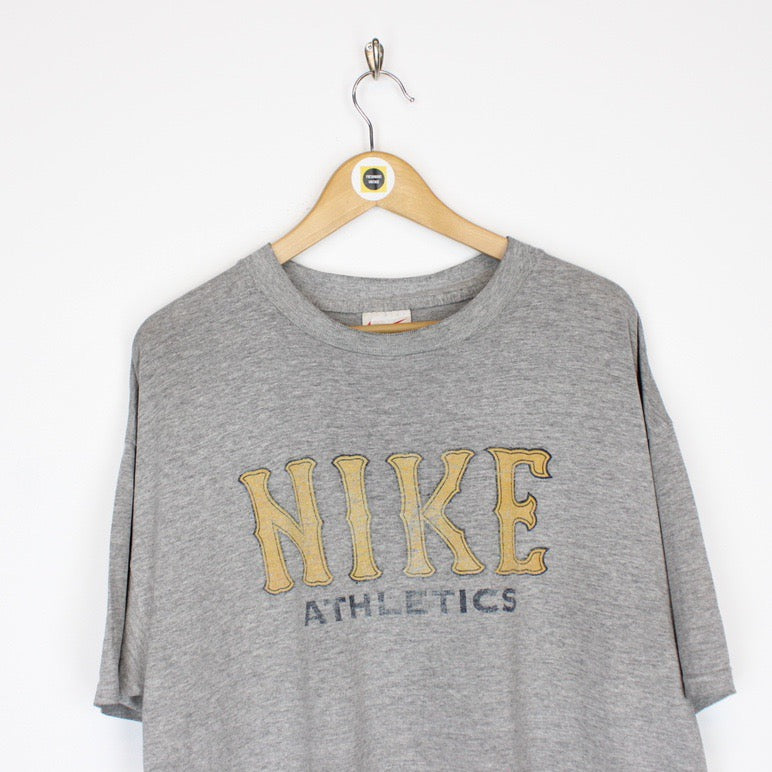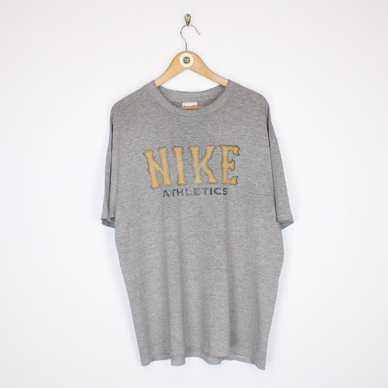 Vintage 90's Nike Grey Crew Neck Short Sleeve Spellout T-Shirt Size on label: XL Our recommended size: XL Pit to pit (inches): 23 Length (inches): 27.5 All products listed are vintage unless stated otherwise in the description. These items are pre-loved and pre-worn, resulting in small signs of wear and fading. We think this adds to their unique authenticity, but if an item has any major flaws these will be stated. - The t-shirt does have a couple of small holes, this is reflected in the price Please contact us if you have any further questions!