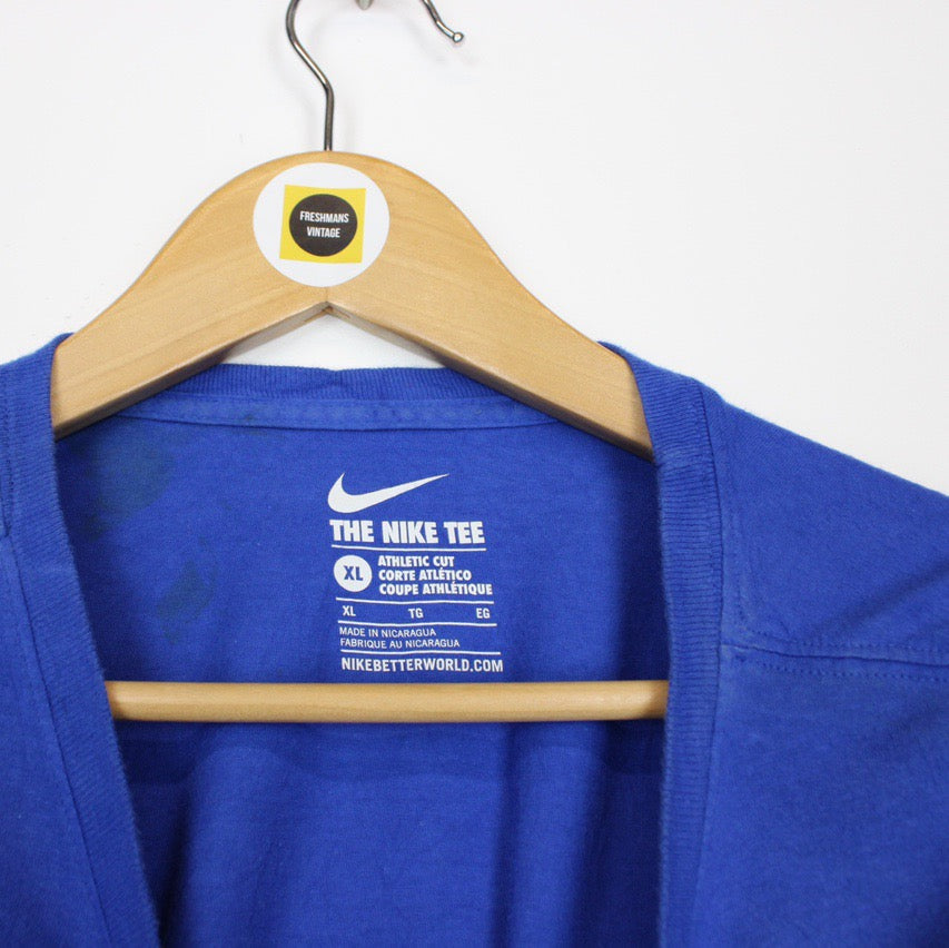 Vintage 00's Nike Blue Crew Neck Short Sleeve Script Spellout T-Shirt Size on label: XL Our recommended size: XL Pit to pit (inches): 23.5 Length (inches): 30.5 All products listed are vintage unless stated otherwise in the description. These items are pre-loved and pre-worn, resulting in small signs of wear and fading. We think this adds to their unique authenticity, but if an item has any major flaws these will be stated. - The tee does have a small faint mark to the front Please contact us if you have any further questions!