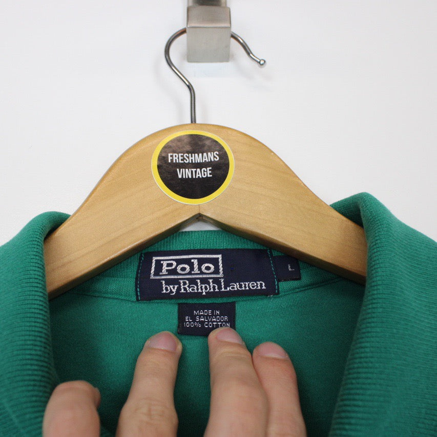 Vintage 00's Polo Ralph Lauren Green Short Sleeve Polo Shirt Size on label: Large Our recommended size: Large Pit to pit (inches): 27.5 Length (inches): 27 All products listed are vintage unless stated otherwise in the description. These items are pre-loved and pre-worn, resulting in small signs of wear and sometimes minor flaws. We think this adds to their unique authenticity, but if an item has any bigger flaws these will be stated. - The polo does have multiple pinholes to both shoulders, this is reflected in the price Please contact us if you have any further questions!