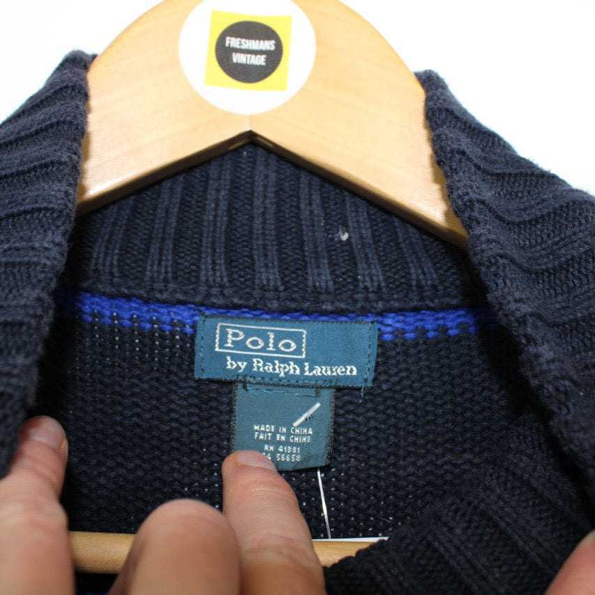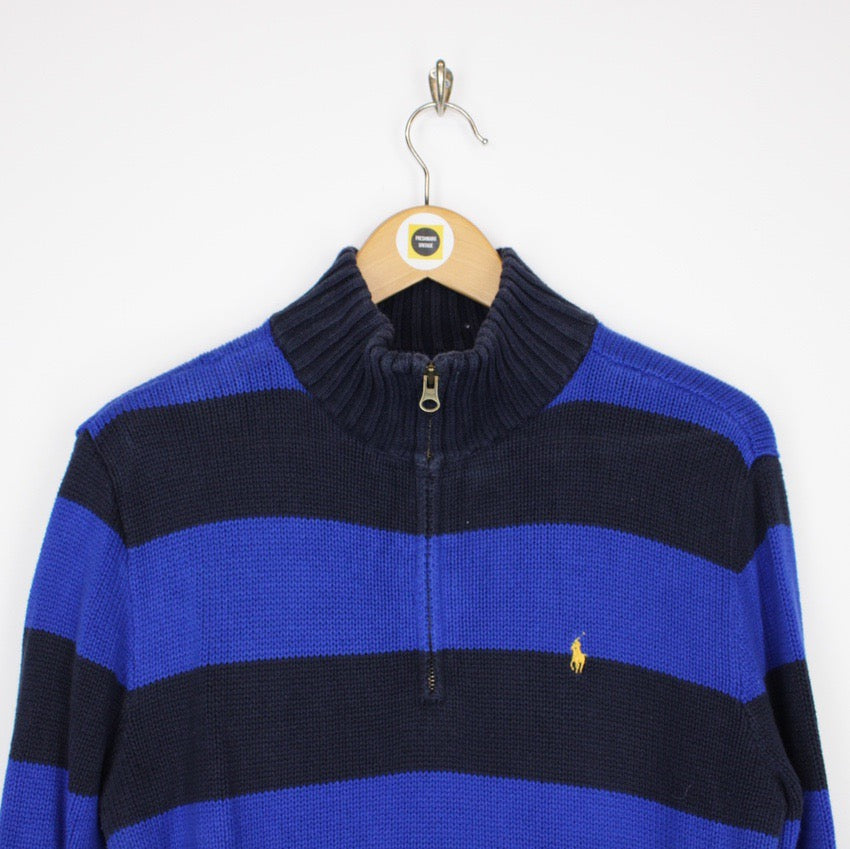 Vintage Polo Ralph Lauren Navy and Blue Striped Pullover 1/4 Zip Sweatshirt Jumper Size on label: N/A Our recommended size: Small Pit to pit (inches): 20 Length (inches): 25 All products listed are vintage unless stated otherwise in the description. These items are pre-loved and pre-worn, resulting in small signs of wear and minor fading. We think this adds to their unique authenticity, but if an item has any major flaws these will be stated below. Please contact us if you have any further questions!