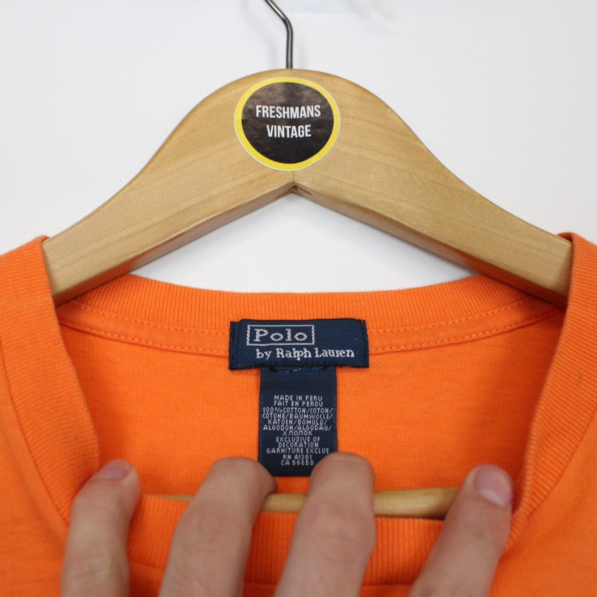 Vintage 90's Polo Ralph Lauren Orange Spellout Short Sleeve T-Shirt Size on label: N/A Our recommended size: Small Pit to pit (inches): 18 Length (inches): 26 All products listed are vintage unless stated otherwise in the description. These items are pre-loved and pre-worn, resulting in small signs of wear and minor fading. We think this adds to their unique authenticity, but if an item has any major flaws these will be stated below. - The t-shirt does have a faint mark to the left shoulder and also to the back, this is reflected in the price Please contact us if you have any further questions!