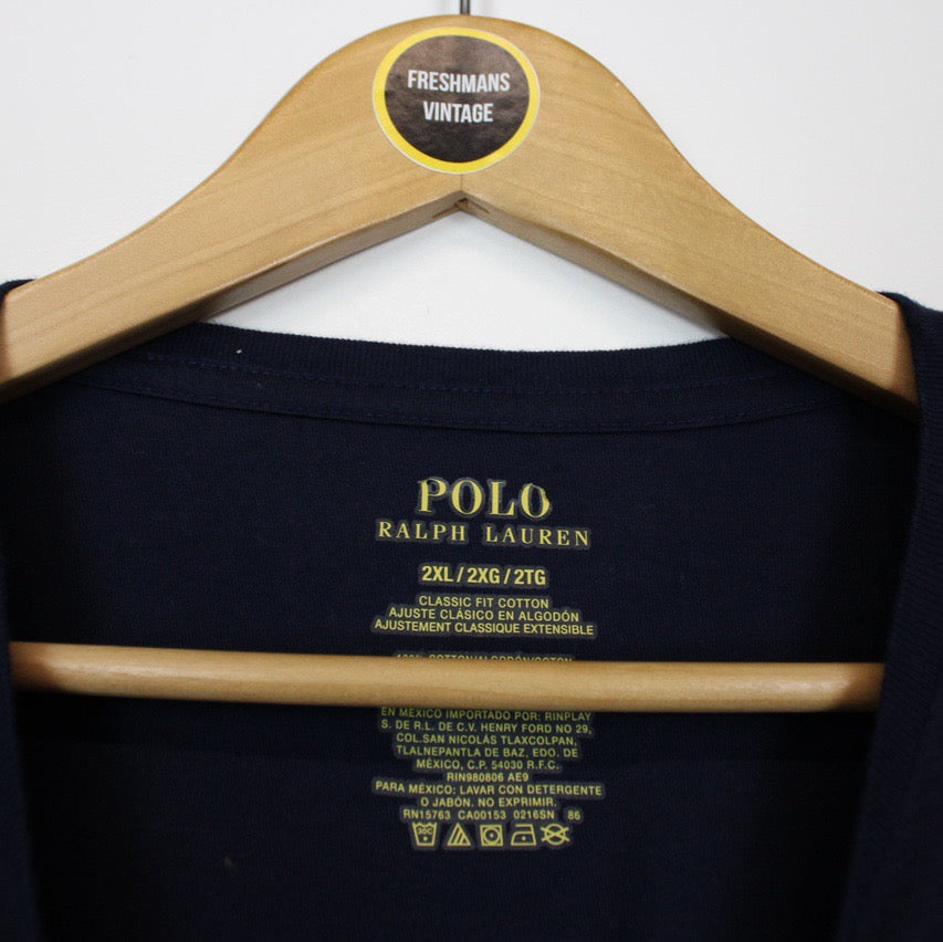 Vintage 00's Polo Ralph Lauren Navy Blue Crew Neck Short Sleeve T-Shirt Size on label: XXL Our recommended size: XXL Pit to pit (inches): 25.5 Length (inches): 31 All products listed are vintage unless stated otherwise in the description. These items are pre-loved and pre-worn, resulting in small signs of wear and minor fading. We think this adds to their unique authenticity, but if an item has any major flaws these will be stated below. Please contact us if you have any further questions!