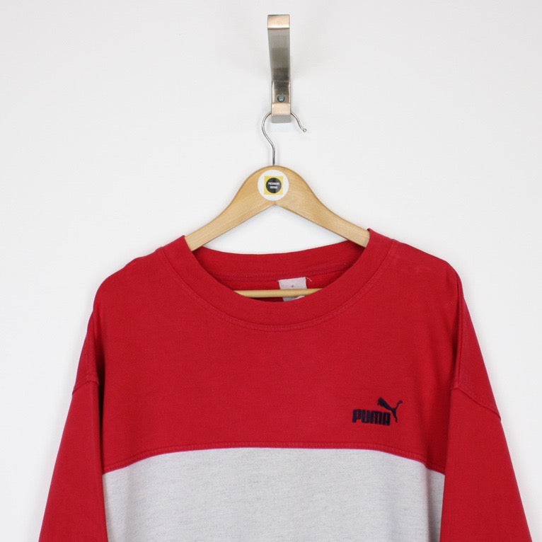 Vintage 90's Puma Red, Navy Blue and Grey Spellout Sweatshirt Jumper - in very good worn condition, classic logo and spellout embroidered on the chest - Men's size XL, 26 inches pit to pit and 28 inches length