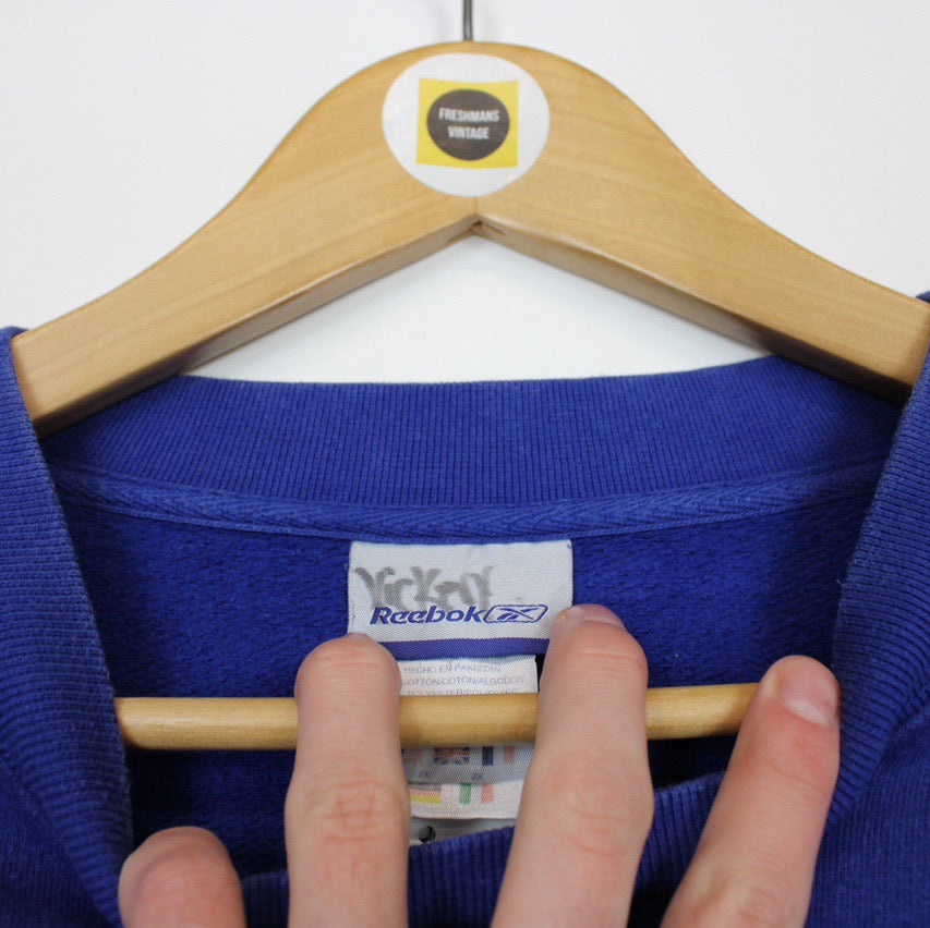 Vintage Reebok Blue Crew Neck Sweatshirt Jumper - in good worn condition, has the reebok logo embroidered on the chest. The sweatshirt does have a mark to the front, this is reflected in the price - men's size XL, 27 inches pit to pit and 28 inches length