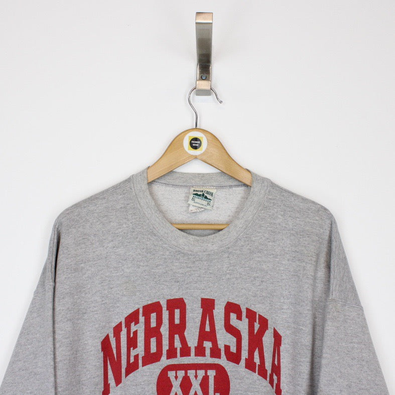 Vintage 90's Nebraska Huskers USA Grey Crew Neck Spellout Sweatshirt Jumper Size on label: Large Our recommended size: Small Pit to pit (inches): 23.5 Length (inches): 25 All products listed are vintage unless stated otherwise in the description. These items are pre-loved and pre-worn, resulting in small signs of wear and minor fading. We think this adds to their unique authenticity - The sweatshirt does have a mark to the front and both of the sleeves, this is reflected in the price Please contact us if you have any further questions!