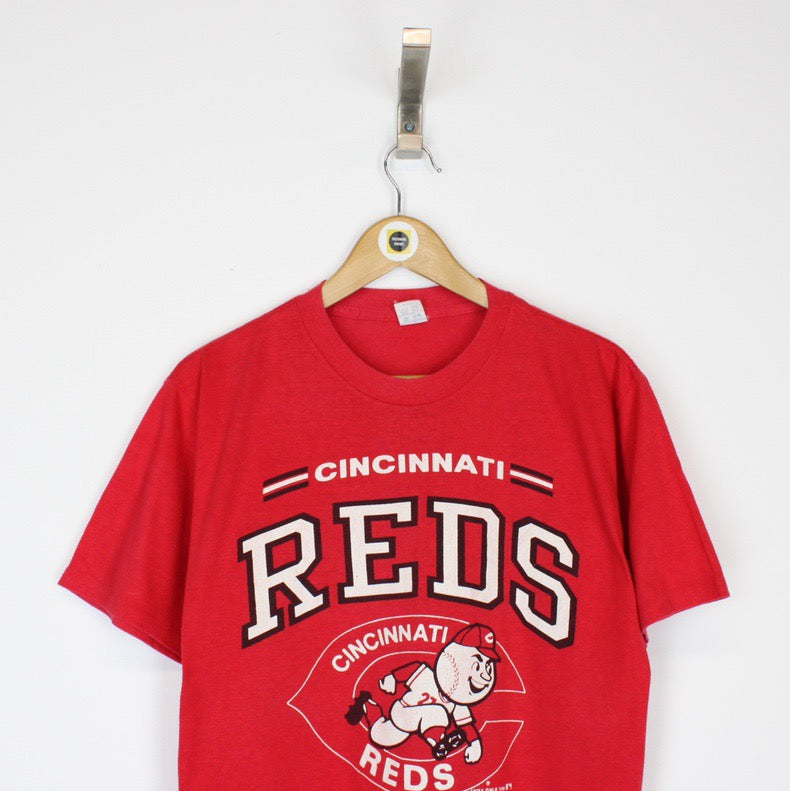 Vintage 1989 Cincinnati Reds MLB Red USA Short Sleeve Spellout T-Shirt Size on label: Medium Our recommended size: Medium Pit to pit (inches): 21 Length (inches): 29 All products listed are vintage unless stated otherwise in the description. These items are pre-loved and pre-worn, resulting in small signs of wear and sometimes minor flaws. We think this adds to their unique authenticity, but if an item has any bigger flaws these will be stated. - The t-shirt has a mark to the front and also a couple to the back, this is reflected in the price Please contact us if you have any further questions!