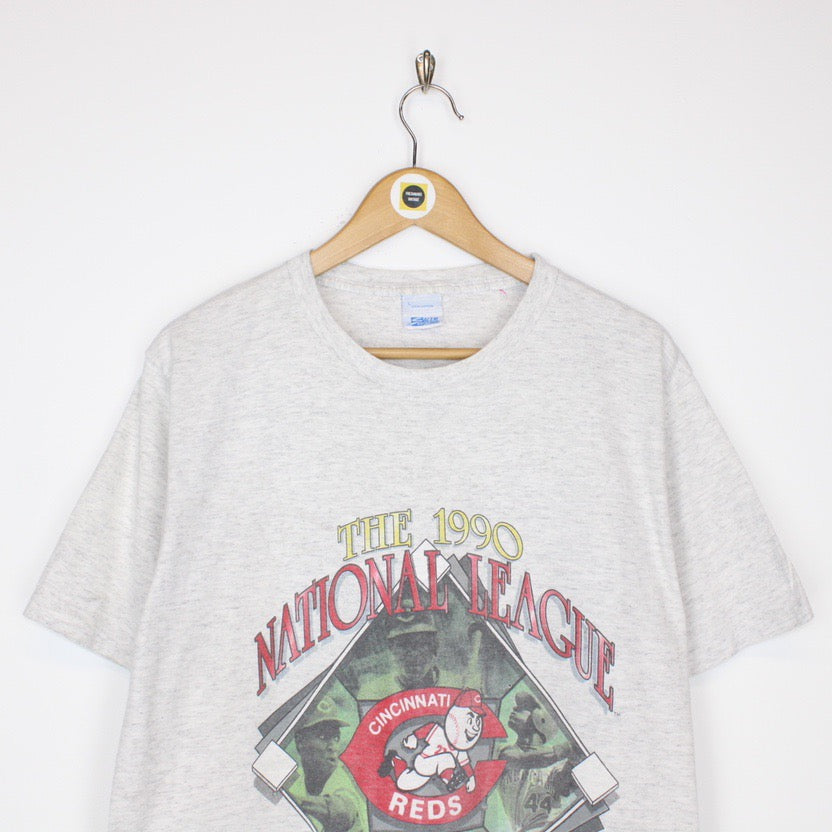 Vintage 1990 Cincinnati Reds MLB Grey USA Short Sleeve Spellout T-Shirt Size on label: Large Our recommended size: Large Pit to pit (inches): 21 Length (inches): 29.5 All products listed are vintage unless stated otherwise in the description. These items are pre-loved and pre-worn, resulting in small signs of wear and sometimes minor flaws. We think this adds to their unique authenticity, but if an item has any bigger flaws these will be stated. Please contact us if you have any further questions!