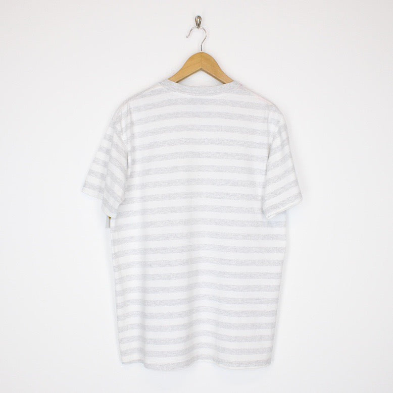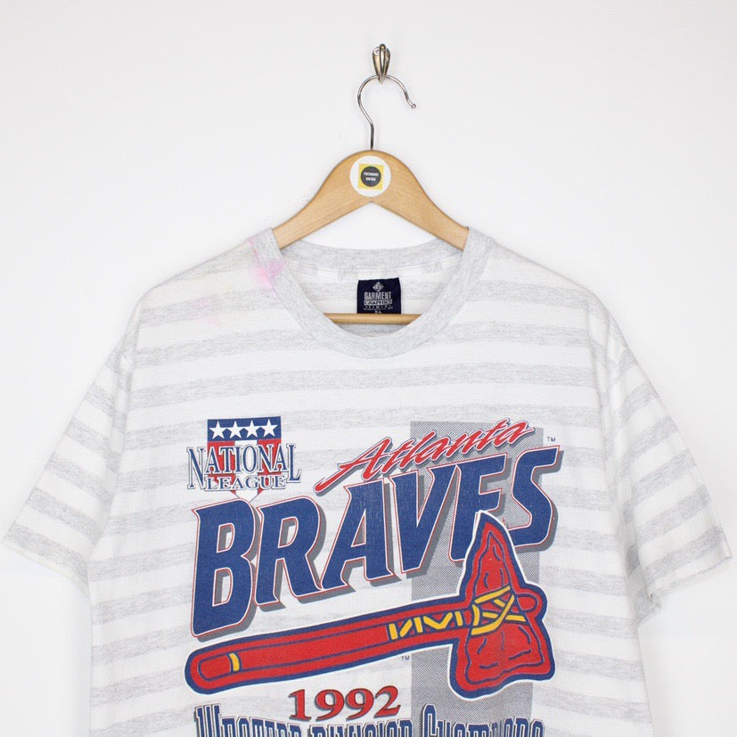 Vintage 1992 Atlanta Braves MLB White and Grey Striped USA Short Sleeve Spellout T-Shirt Size on label: XL Our recommended size: XL Pit to pit (inches): 22 Length (inches): 30 All products listed are vintage unless stated otherwise in the description. These items are pre-loved and pre-worn, resulting in small signs of wear and sometimes minor flaws. We think this adds to their unique authenticity, but if an item has any bigger flaws these will be stated. - The t-shirt has a mark to the right shoulder, this is reflected in the price Please contact us if you have any further questions!