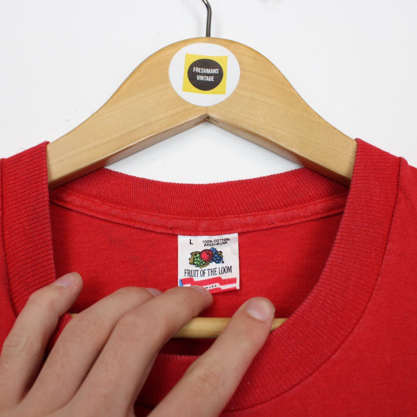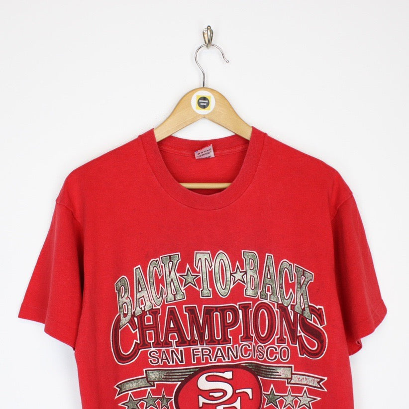 Vintage 90's San Francisco 49ers NFL Super Bowl Red USA Short Sleeve Spellout T-Shirt Size on label: Large Our recommended size: Large Pit to pit (inches): 21 Length (inches): 28.5 All products listed are vintage unless stated otherwise in the description. These items are pre-loved and pre-worn, resulting in small signs of wear and sometimes minor flaws. We think this adds to their unique authenticity, but if an item has any bigger flaws these will be stated. - The t-shirt does have some marks to the front, this is reflected in the price Please contact us if you have any further questions!