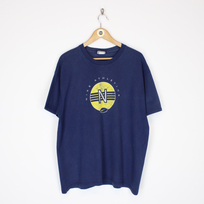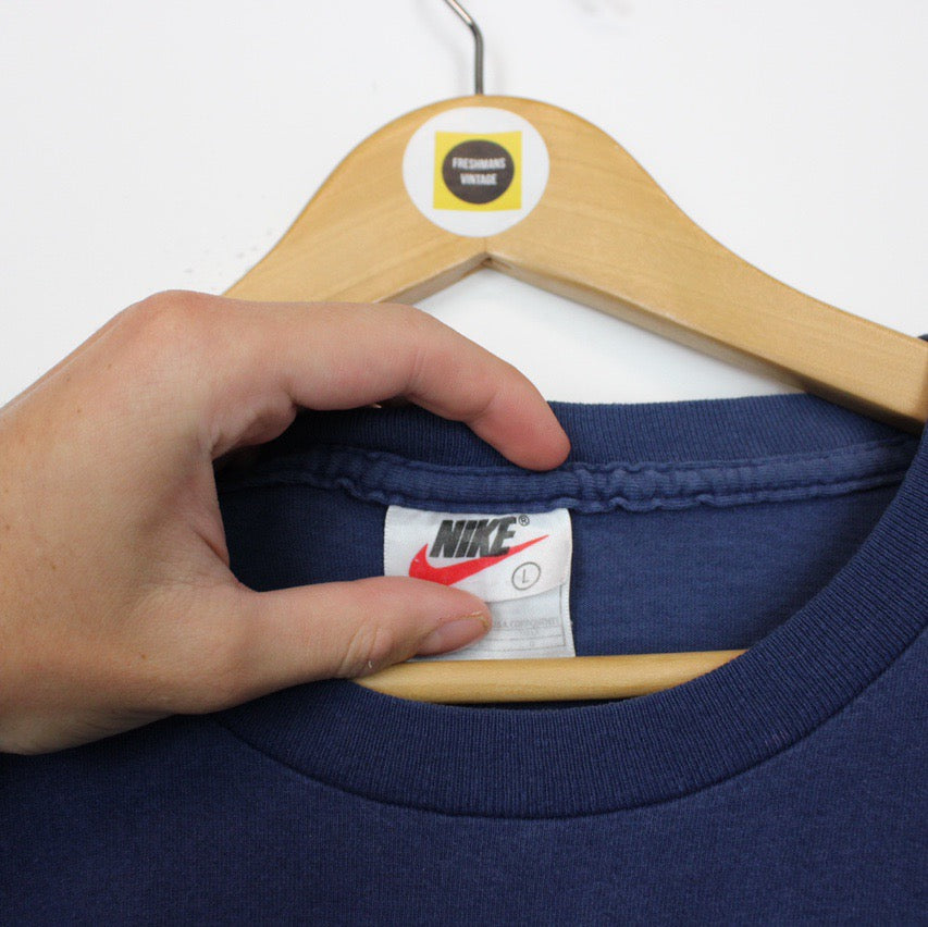Vintage 90's Nike Navy Blue Crew Neck Short Sleeve Spellout T-Shirt Size on label: Large Our recommended size: Large Pit to pit (inches): 22.5 Length (inches): 29 All products listed are vintage unless stated otherwise in the description. These items are pre-loved and pre-worn, resulting in small signs of wear and fading. We think this adds to their unique authenticity, but if an item has any major flaws these will be stated. - The t-shirt does have a couple of pin holes to the back of the right shoulder, this is reflected in the price Please contact us if you have any further questions!