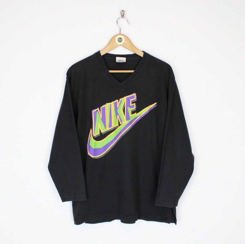 Vintage 90's Nike Black and Multicoloured Crew Neck Long Sleeve Spellout T-Shirt Size on label: Medium Our recommended size: Medium Pit to pit (inches): 21 Length (inches): 28 All products listed are vintage unless stated otherwise in the description. These items are pre-loved and pre-worn, resulting in small signs of wear and fading. We think this adds to their unique authenticity, but if an item has any major flaws these will be stated. Please contact us if you have any further questions!