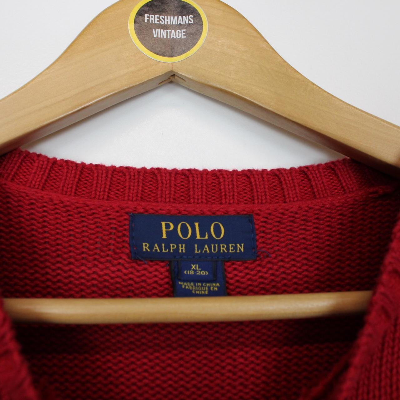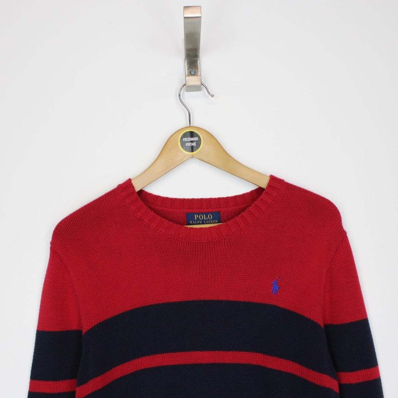 Polo Ralph Lauren Red and Navy Blue Cotton Knit Sweatshirt Jumper Size on label: XL Our recommended size: Medium Pit to pit (inches): 18 Length (inches): 25.5 Condition: Very good condition All our products are pre-worn unless stated otherwise in the description. These items have been worn, resulting in signs of wear and use. If an item has any major flaws these will be stated above in the condition section. Please contact us if you have any further questions!