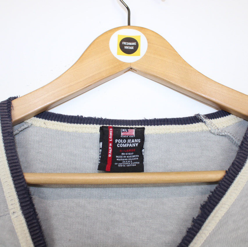 Vintage 90's Ralph Lauren Polo Jeans Grey and Navy Blue Spellout Short Sleeve T-Shirt Size on label: XL Our recommended size: XL Pit to pit (inches): 25 Length (inches): 29 All products listed are vintage unless stated otherwise in the description. These items are pre-loved and pre-worn, resulting in small signs of wear and fading. We think this adds to their unique authenticity, but if an item has any major flaws these will be stated. - The t-shirt does have some shredding to the collar, along with a mark, this is reflected in the price Please contact us if you have any further questions!