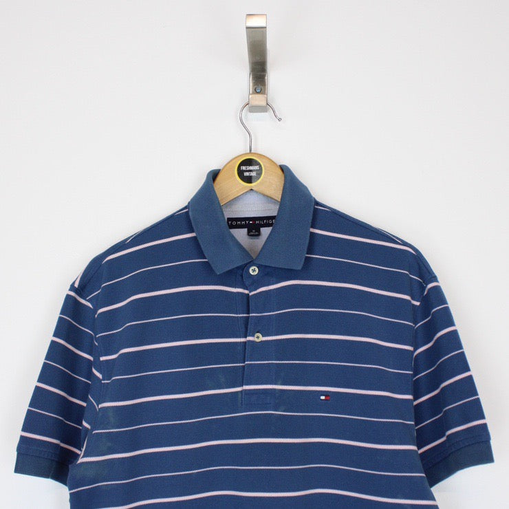 Vintage 00's Tommy Hilfiger Blue and White Striped Short Sleeve Polo Shirt Size on label: Medium Our recommended size: Medium Pit to pit (inches): 20.5 Length (inches): 27.5 All products listed are vintage unless stated otherwise in the description. These items are pre-loved and pre-worn, resulting in small signs of wear and minor fading. We think this adds to their unique authenticity, but if an item has any major flaws these will be stated below. - The polo does have a few light marks to the front, this is reflected in the price Please contact us if you have any further questions!