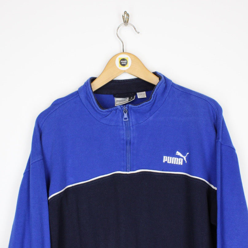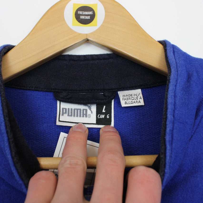 Vintage 00's Puma Blue and Black 1/4 Zip Pullover Spellout Sweatshirt Jumper - in very good worn condition, has the embroidered logo on the chest! - men's size Large, pit to pit measures 23 inches and the length 27 inches, looks sick oversized on a medium