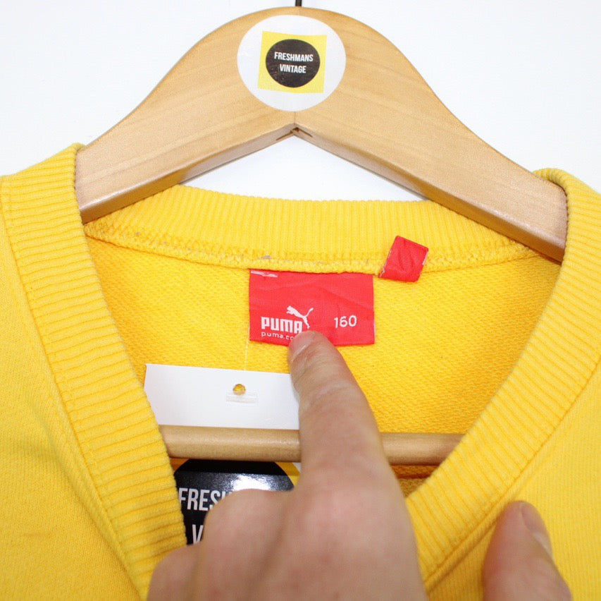 Vintage 90's Puma Yellow and Green Crew Neck Spellout Sweatshirt Jumper Size on label: 160 Our recommended size: Small Pit to pit (inches): 21 Length (inches): 25 All products listed are vintage unless stated otherwise in the description. These items are pre-loved and pre-worn, resulting in small signs of wear and sometimes minor flaws. We think this adds to their unique authenticity, but if an item has any bigger flaws these will be stated. - The sweatshirt does have a very small mark to the front Please contact us if you have any further questions!