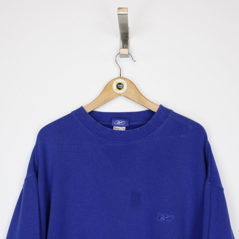 Vintage Reebok Blue Crew Neck Sweatshirt Jumper - in good worn condition, has the reebok logo embroidered on the chest. The sweatshirt does have a mark to the front, this is reflected in the price - men's size XL, 27 inches pit to pit and 28 inches length