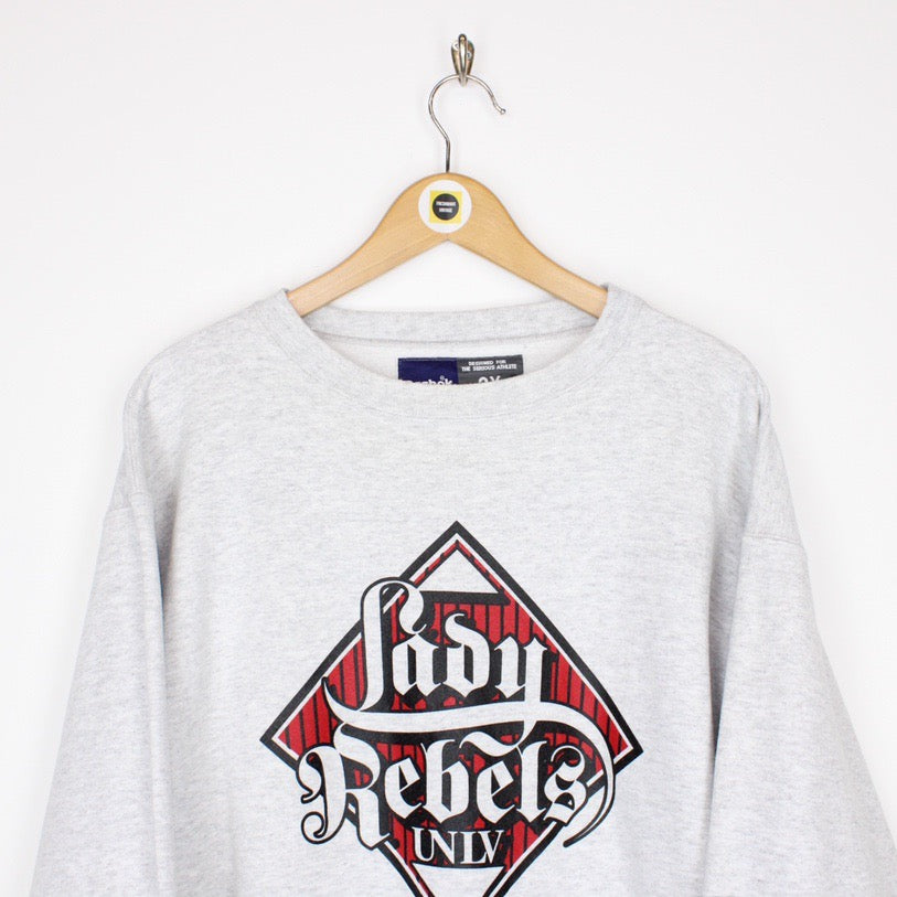 Vintage 90's Reebok Lady Rebels Light Grey USA Spellout Sweatshirt Jumper Size on label: XXL Our recommended size: XXL Pit to pit (inches): 26 Length (inches): 29 All products listed are vintage unless stated otherwise in the description. These items are pre-loved and pre-worn, resulting in small signs of wear and sometimes minor flaws. We think this adds to their unique authenticity, but if an item has any bigger flaws these will be stated. Please contact us if you have any further questions!