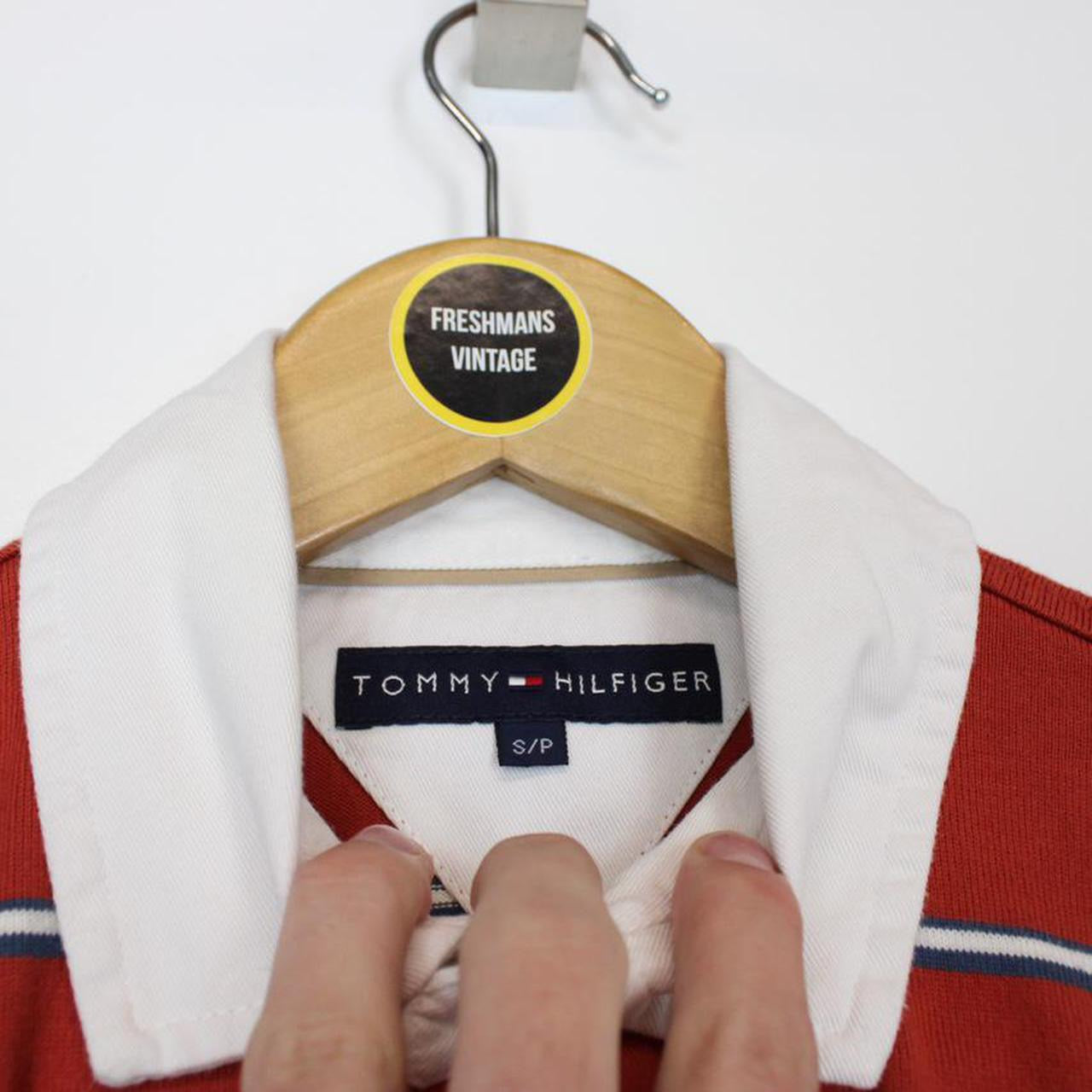 Vintage 00's Tommy Hilfiger Orange and White Striped Long Sleeve Rugby Shirt Size on label: Small Our recommended size: Small Pit to pit (inches): 20 Length (inches): 25.5 All products listed are vintage unless stated otherwise in the description. These items are pre-loved and pre-worn, resulting in small signs of wear and minor fading. We think this adds to their unique authenticity, but if an item has any major flaws these will be stated below. Please contact us if you have any further questions!