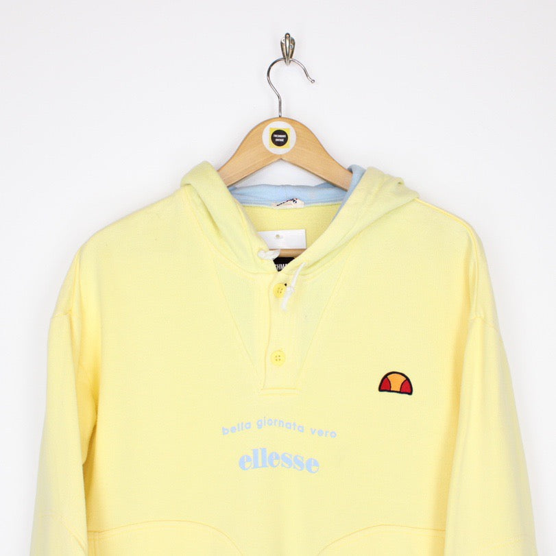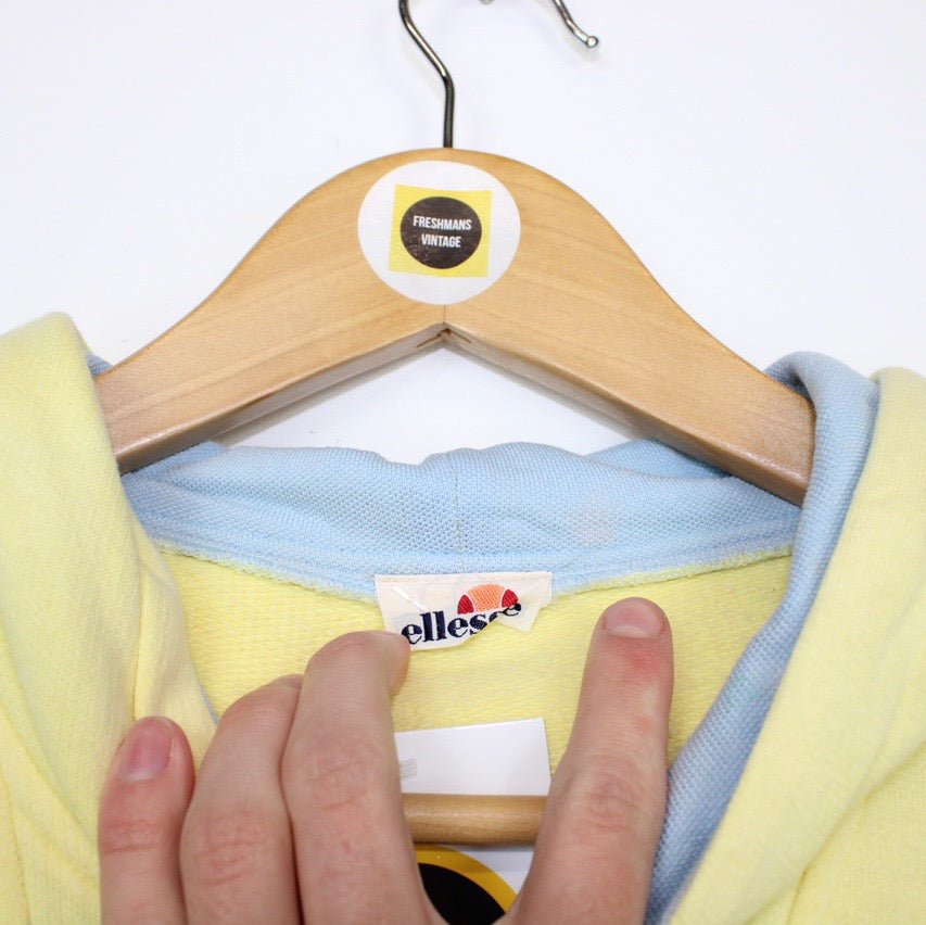 Vintage 90's Ellesse Pale Yellow and Light Blue Pullover Spellout Hoodie Jumper Size on label: Women's Medium Our recommended size: Women's Medium Pit to pit (inches): 21.5 Length (inches): 25 All products listed are vintage unless stated otherwise in the description. These items are pre-loved and pre-worn, resulting in small signs of wear and sometimes minor flaws. We think this adds to their unique authenticity, but if an item has any bigger flaws these will be stated. Please contact us if you have any further questions!