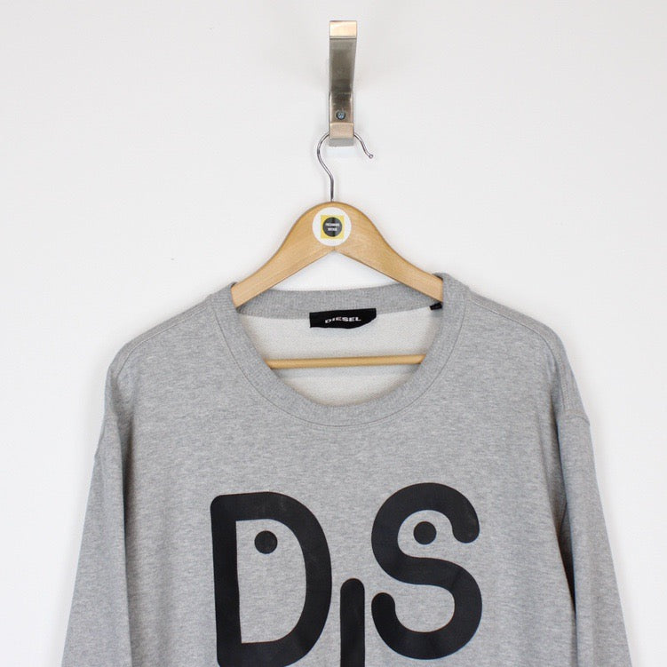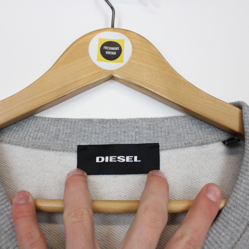 Diesel Grey and Black Crew Neck Spellout Sweatshirt Jumper Size on label: XL Our recommended size: XL Pit to pit (inches): 25 Length (inches): 30 All products listed are vintage unless stated otherwise in the description. These items are pre-loved and pre-worn, resulting in small signs of wear and minor fading. We think this adds to their unique authenticity, but if an item has any major flaws these will be stated below. - The sweatshirt has a couple of marks to the back, this is reflected in the price Please contact us if you have any further questions!