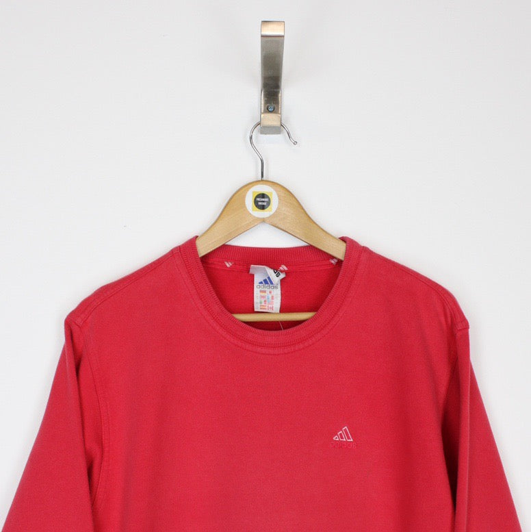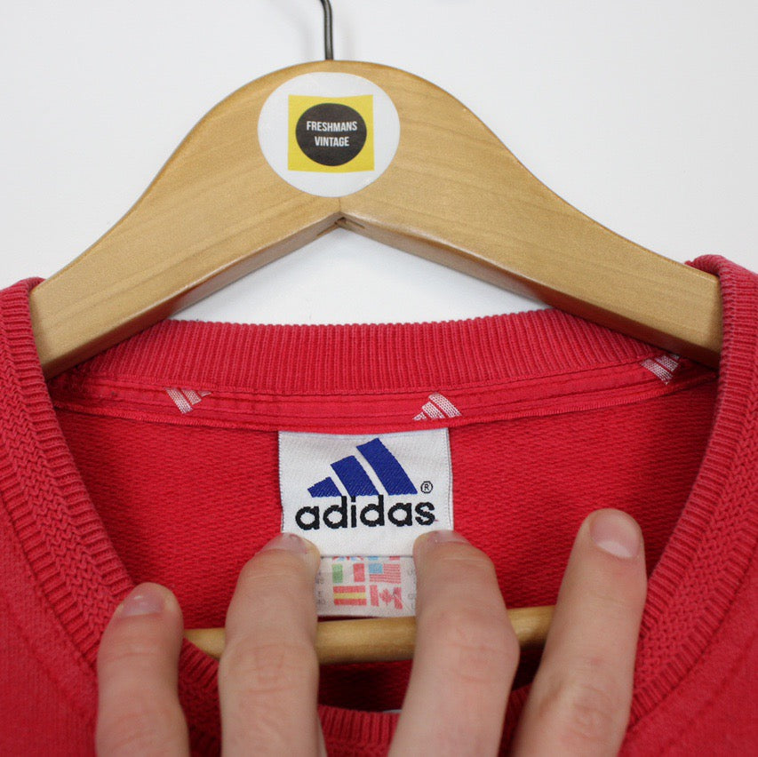 Vintage 90's Adidas Red Crew Neck Spellout Sweatshirt Jumper - in good worn condition, embroidered logo on the chest! The item has a small hole to the back left shoulder and also a small mark to the front - men's size Medium, pit to pit measures 21 inches and the length 26 inches - instant buy is on ✅message us with any questions✅