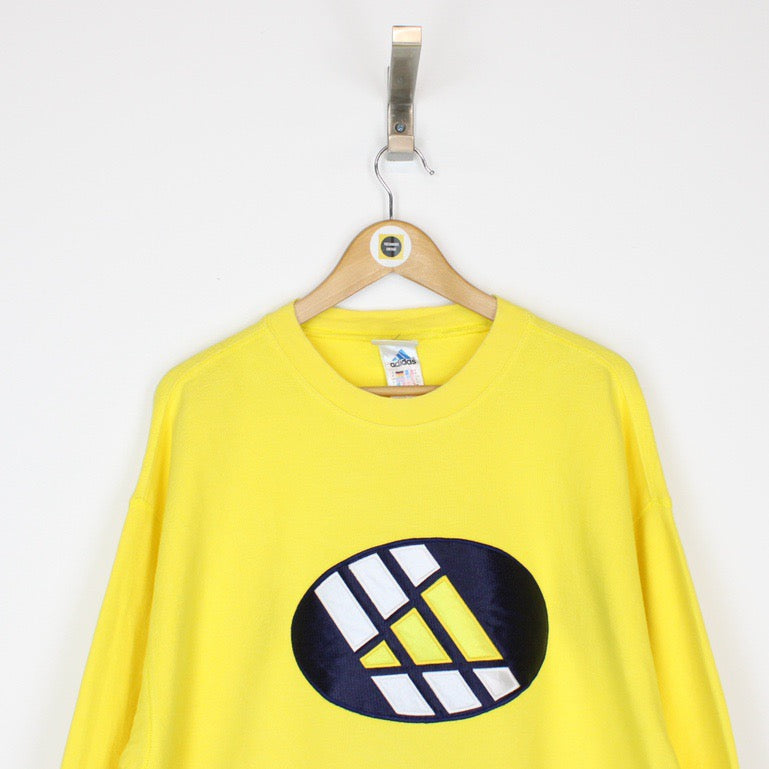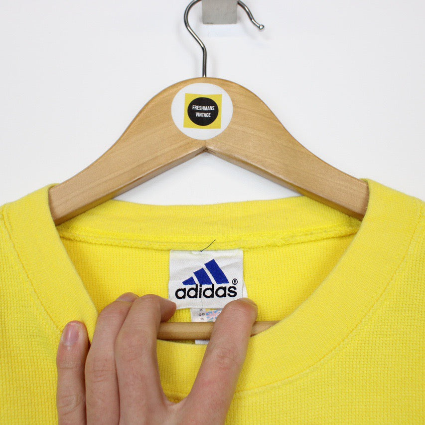 Vintage 90's Adidas Yellow and Navy Blue Crew Neck Spellout Sweatshirt Jumper Size on label: MediumOur recommended size: Oversized MediumPit to pit (inches): 25Length (inches): 28.5All products listed are vintage unless stated otherwise in the description. These items are pre-loved and pre-worn, resulting in small signs of wear and minor fading. We think this adds to their unique authenticity, but if an item has any major flaws these will be stated below.Please contact us if you have any further questions!Stock Code: HU905