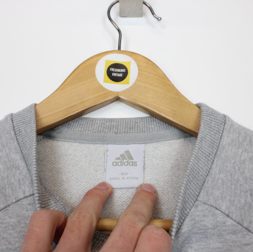 Vintage 00's Adidas Grey Crew Neck Spellout Sweatshirt Jumper Size on label: 160 Our recommended size: Small Pit to pit (inches): 18.5 Length (inches): 26 All products listed are vintage unless stated otherwise in the description. These items are pre-loved and pre-worn, resulting in small signs of wear and fading. We think this adds to their unique authenticity, but if an item has any major flaws these will be stated. - The sweatshirt has a mark to the front, this is reflected in the price Please contact us if you have any further questions!