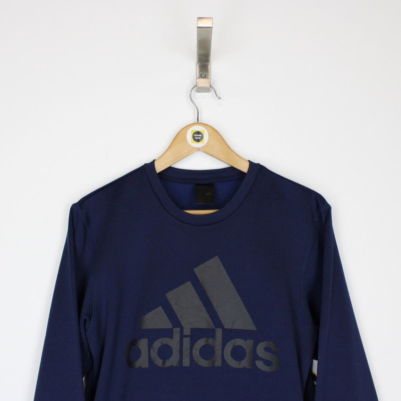 Vintage 00's Adidas Navy Blue and Black Spellout Sweatshirt Jumper Size on label: N/A Our recommended size: Small Pit to pit (inches): 19 Length (inches): 25.5 All products listed are vintage unless stated otherwise in the description. These items are pre-loved and pre-worn, resulting in small signs of wear and fading. We think this adds to their unique authenticity, but if an item has any major flaws these will be stated. Please contact us if you have any further questions!
