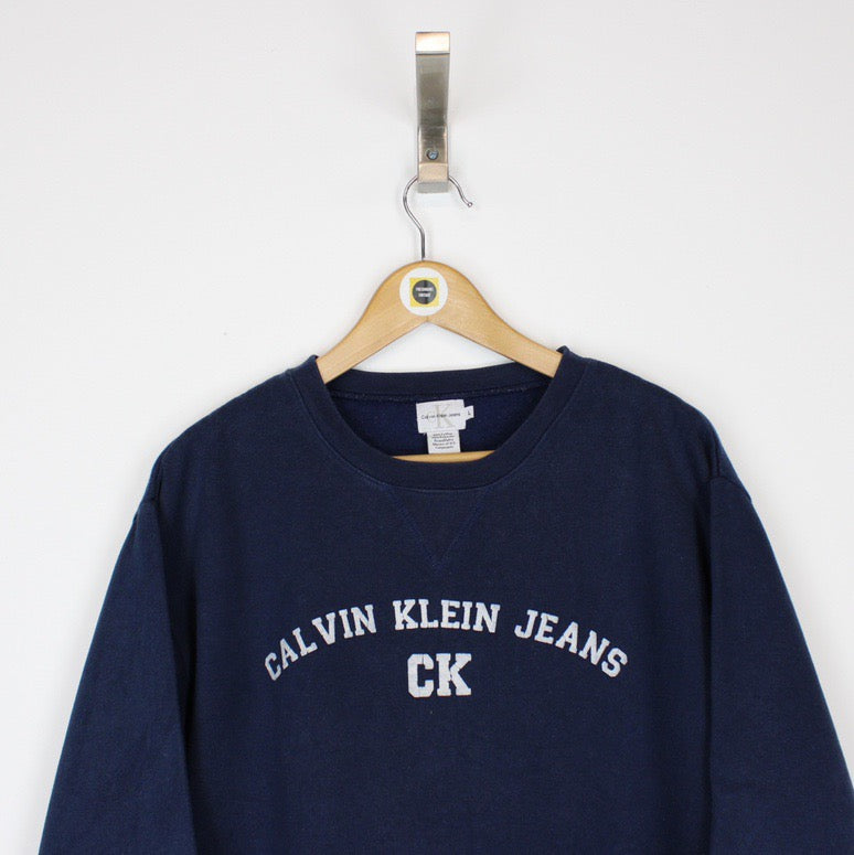 Vintage Calvin Klein Jeans Navy Blue and White Cropped Spellout Sweatshirt Jumper Size on label: Women's Large Our recommended size: Women's Large Pit to pit (inches): 22.5 Length (inches): 22 All products listed are vintage unless stated otherwise in the description. These items are pre-loved and pre-worn, resulting in small signs of wear and fading. We think this adds to their unique authenticity, but if an item has any major flaws these will be stated. Please contact us if you have any further questions!