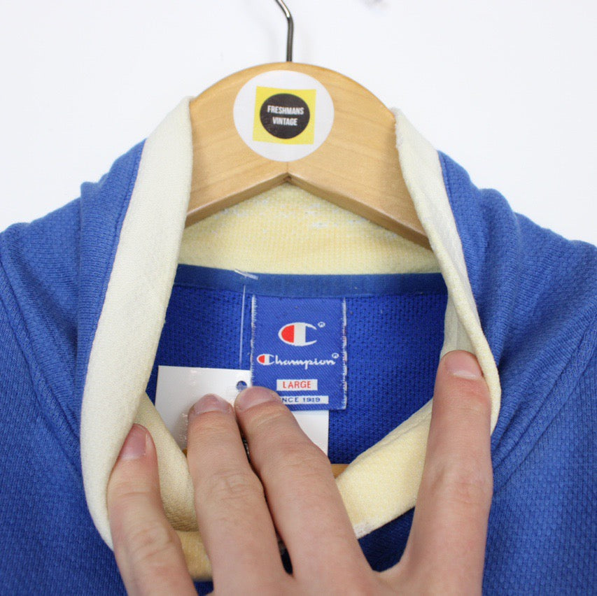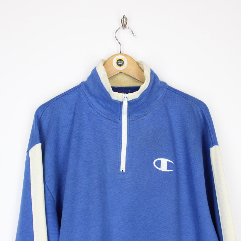 Vintage 90's Champion Blue and White Pullover 1/4 Zip Sweatshirt Jumper Size on label: Large Our recommended size: Large Pit to pit (inches): 25 Length (inches): 31 All products listed are vintage unless stated otherwise in the description. These items are pre-loved and pre-worn, resulting in small signs of wear and minor fading. We think this adds to their unique authenticity, but if an item has any major flaws these will be stated below. Please contact us if you have any further questions!