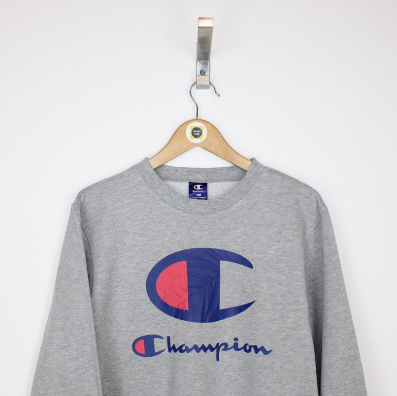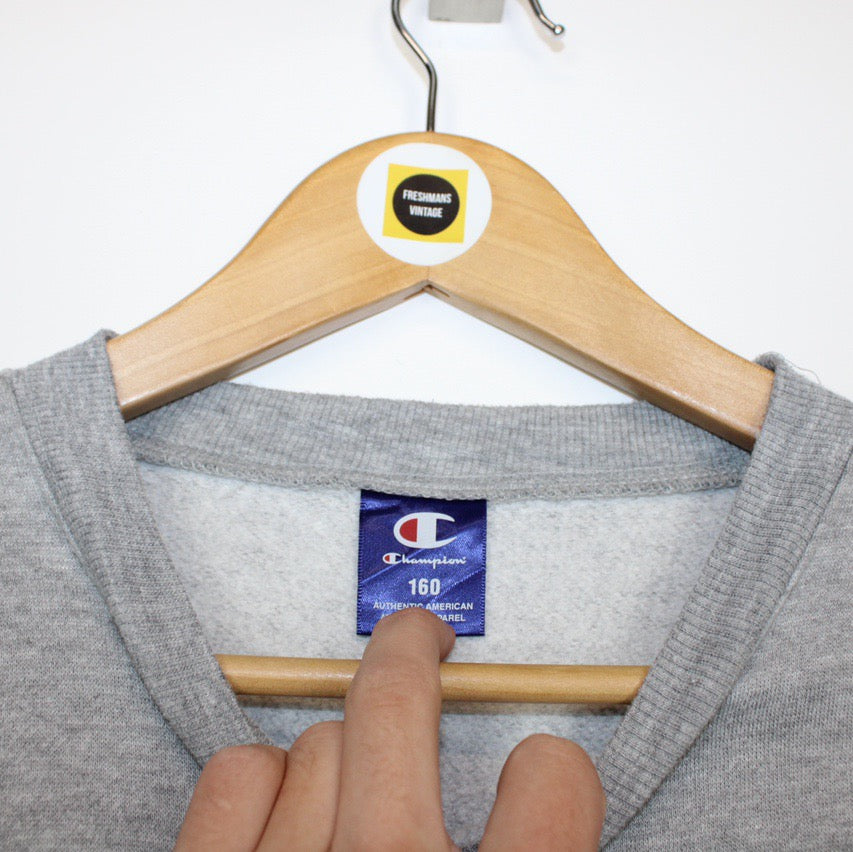 Vintage 00's Champion Grey and Blue Crew Neck Spellout Sweatshirt Jumper Size on label: 160 Our recommended size: Women's Medium Pit to pit (inches): 18.5 Length (inches): 24.5 All products listed are vintage unless stated otherwise in the description. These items are pre-loved and pre-worn, resulting in small signs of wear and sometimes minor flaws. We think this adds to their unique authenticity, but if an item has any bigger flaws these will be stated. Please contact us if you have any further questions!