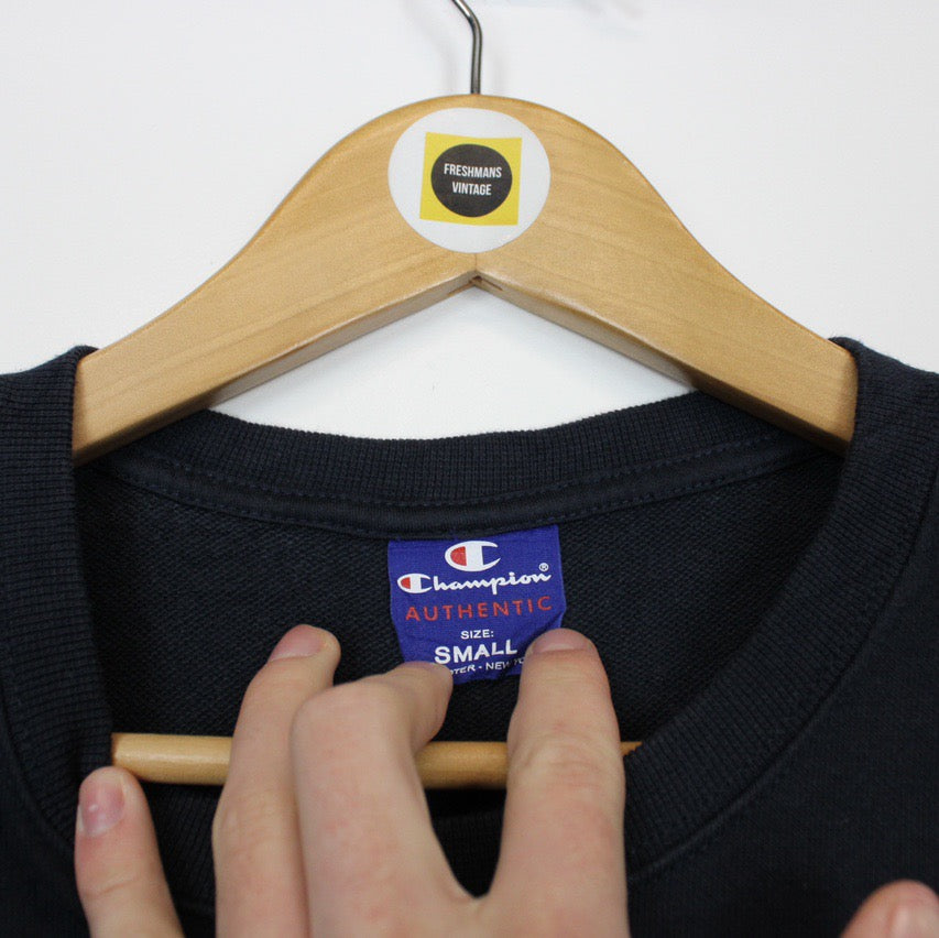Vintage 00's Champion Navy Blue Crew Neck Spellout Sweatshirt Jumper Size on label: Small Our recommended size: Small Pit to pit (inches): 20 Length (inches): 25 All products listed are vintage unless stated otherwise in the description. These items are pre-loved and pre-worn, resulting in small signs of wear and minor fading. We think this adds to their unique authenticity, but if an item has any major flaws these will be stated below. Please contact us if you have any further questions!