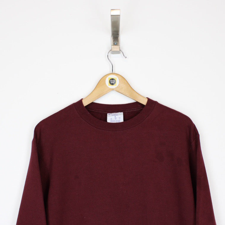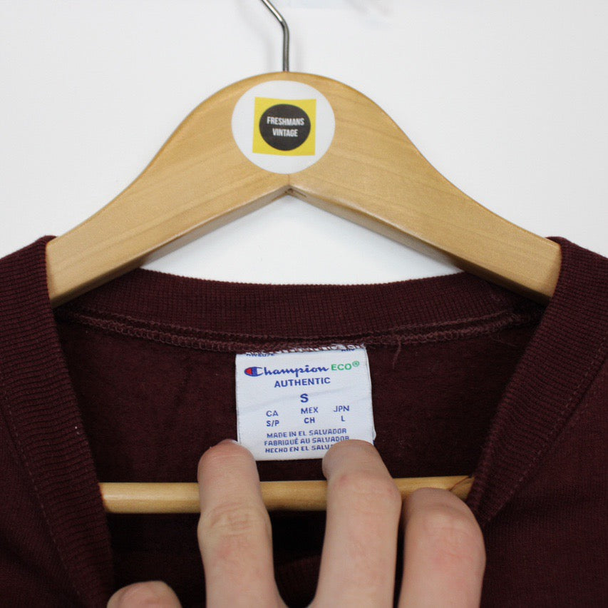 Vintage 90's Champion Burgundy Crew Neck Sweatshirt Jumper Size on label: Small Our recommended size: Small Pit to pit (inches): 20.5 Length (inches): 27.5 All products listed are vintage unless stated otherwise in the description. These items are pre-loved and pre-worn, resulting in small signs of wear and fading. We think this adds to their unique authenticity, but if an item has any major flaws these will be stated. - The sweatshirt has some prominent marking throughout, this is reflected in the price Please contact us if you have any further questions!