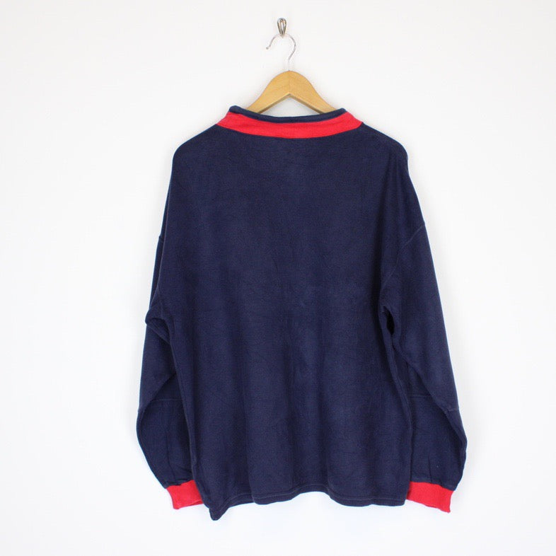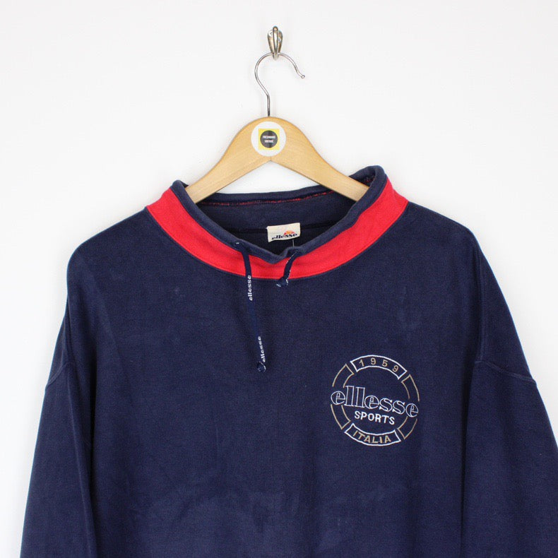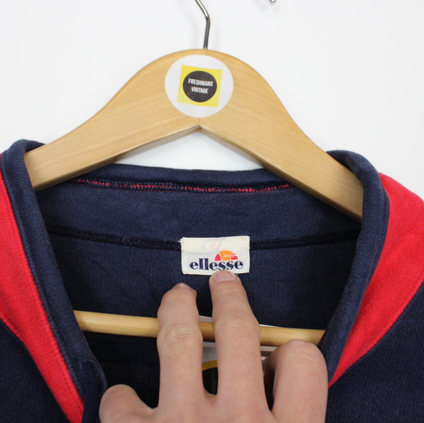 Vintage 90's Ellesse Navy Blue and Red Mock Neck Spellout Sweatshirt Jumper Size on label: Large Our recommended size: Large Pit to pit (inches): 24 Length (inches): 27 All products listed are vintage unless stated otherwise in the description. These items are pre-loved and pre-worn, resulting in small signs of wear and sometimes minor flaws. We think this adds to their unique authenticity, but if an item has any bigger flaws these will be stated. - The sweatshirt does have a patch of discolouration/fading on the front Please contact us if you have any further questions!