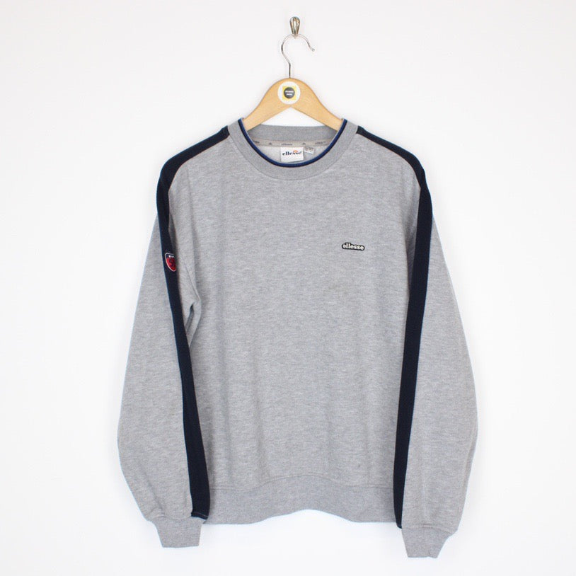 Vintage 90's Ellesse Grey and Black Crew Neck Spellout Sweatshirt Jumper - in very good worn condition, has black accents and the Ellesse spellout embroidered on the chest - men's size Small, measures 21 inches pit to pit and 25 inches in length