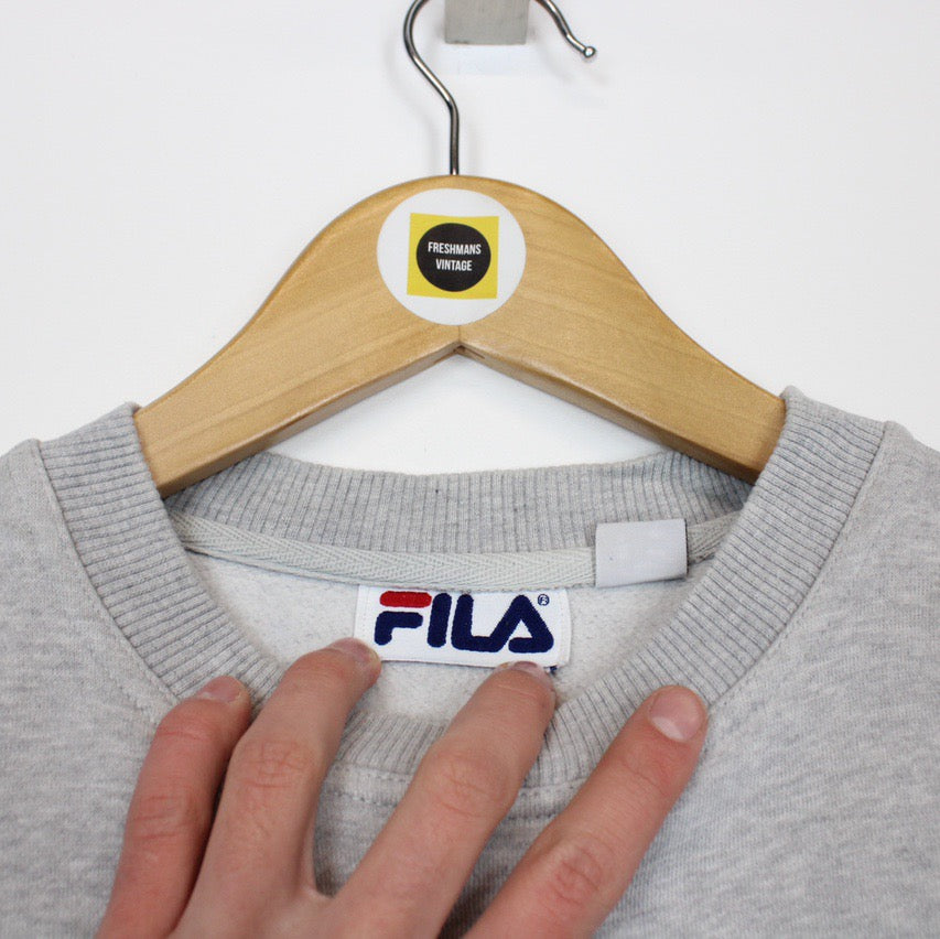 Vintage 00's Fila Grey Crew Neck Spellout Sweatshirt Jumper Size on label: Small Our recommended size: Small Pit to pit (inches): 21 Length (inches): 25 All products listed are vintage unless stated otherwise in the description. These items are pre-loved and pre-worn, resulting in small signs of wear and minor fading. We think this adds to their unique authenticity, but if an item has any major flaws these will be stated below. Please contact us if you have any further questions!