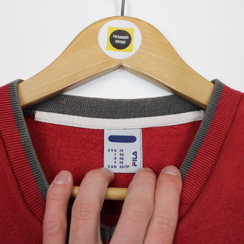 Vintage 90's Fila Red Spellout Sweatshirt Jumper Size on label: XS Our recommended size: XS Pit to pit (inches): 22 Length (inches): 24 All products listed are vintage unless stated otherwise in the description. These items are pre-loved and pre-worn, resulting in small signs of wear and minor fading. We think this adds to their unique authenticity, but if an item has any major flaws these will be stated below. Please contact us if you have any further questions!