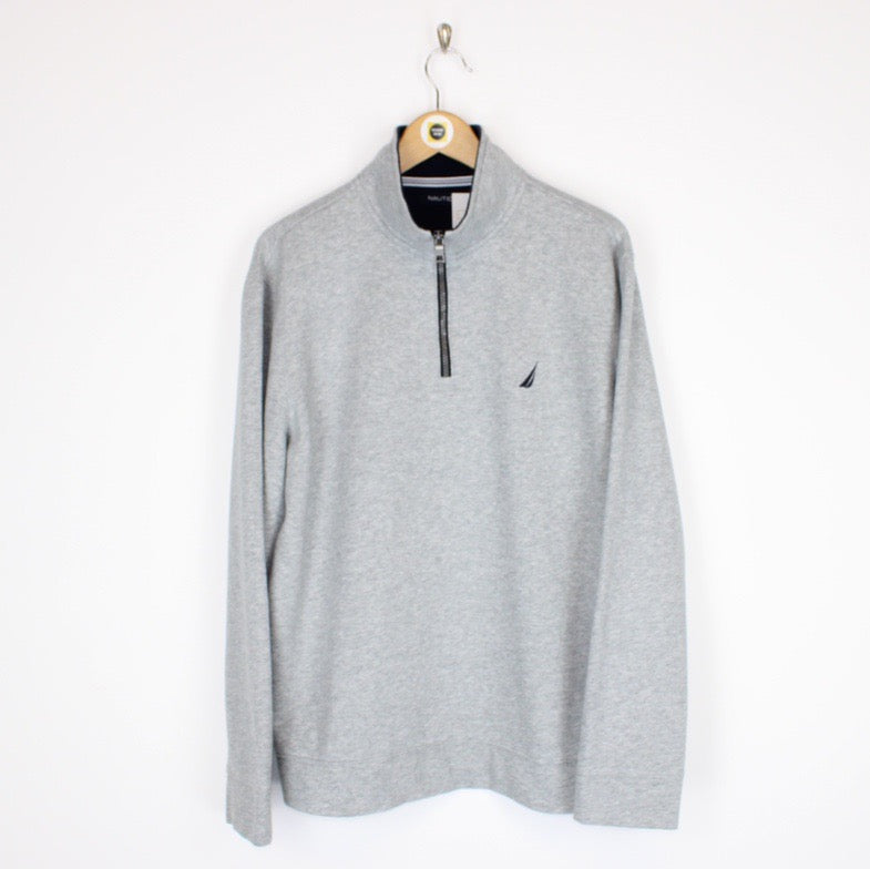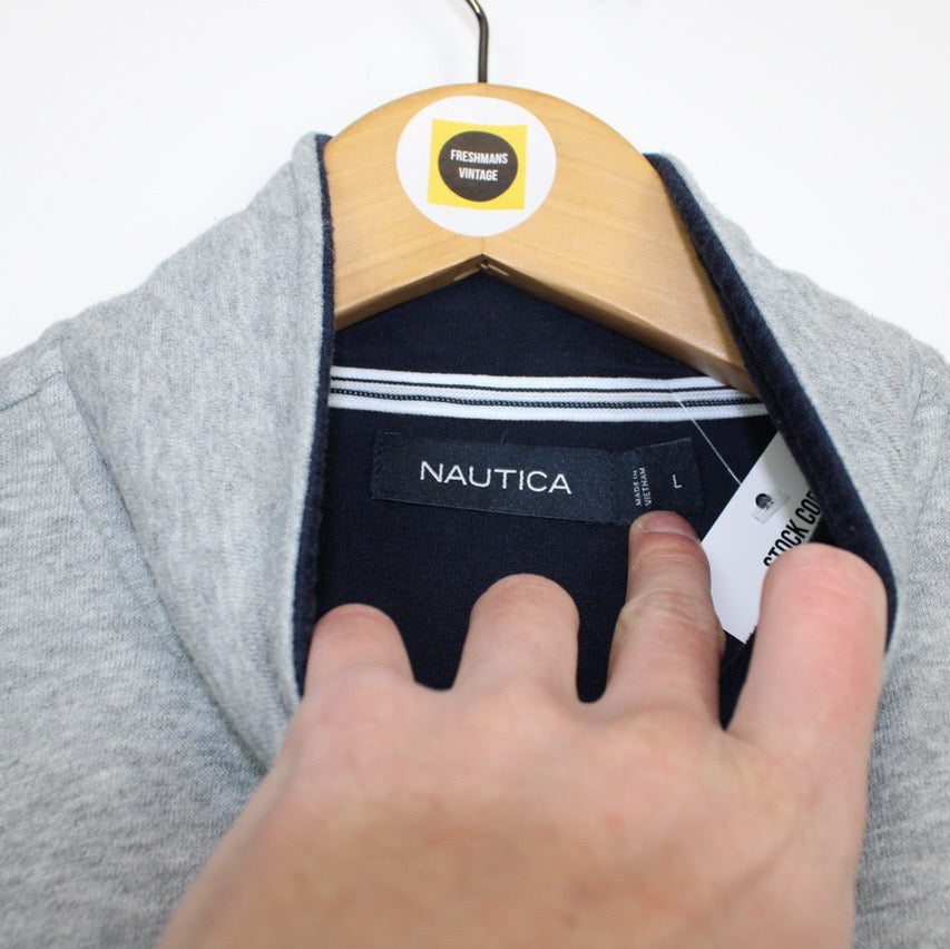 Vintage 00's Nautica Light Grey and Navy Blue Pullover 1/4 Zip Sweatshirt Jumper Size on label: Large Our recommended size: Large Pit to pit (inches): 24 Length (inches): 27.5 All products listed are vintage unless stated otherwise in the description. These items are pre-loved and pre-worn, resulting in small signs of wear and sometimes minor flaws. We think this adds to their unique authenticity, but if an item has any bigger flaws these will be stated. Please contact us if you have any further questions!