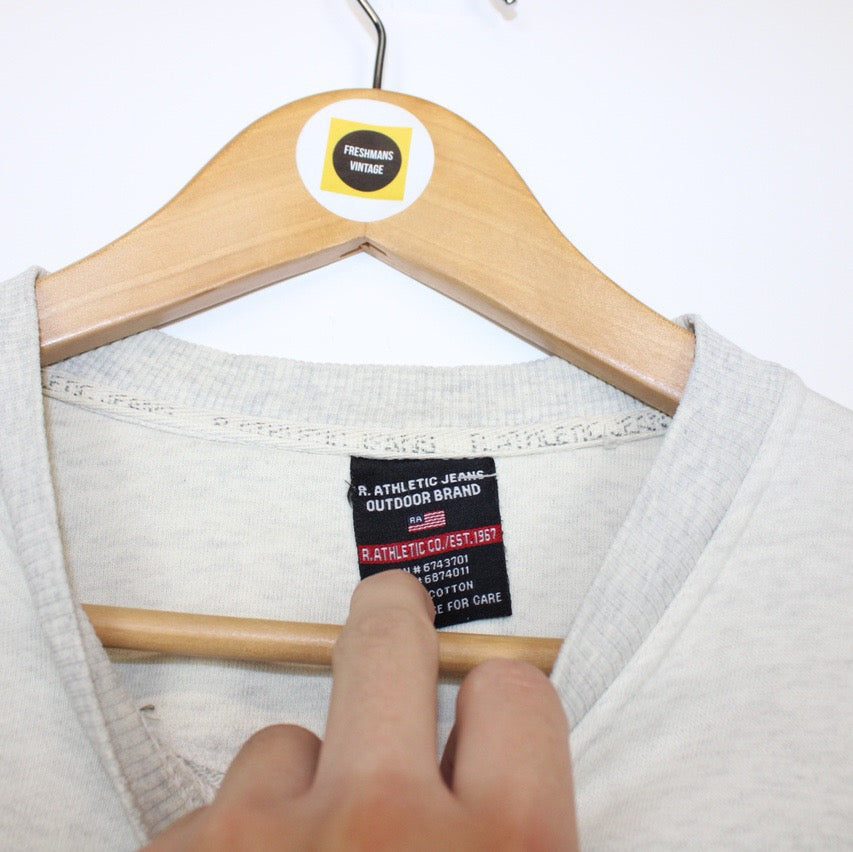 Vintage 90's R Athlethic Grey Crew Neck Spellout Sweatshirt Jumper Size on label: XL Our recommended size: XL Pit to pit (inches): 24.5 Length (inches): 28.5 All products listed are vintage unless stated otherwise in the description. These items are pre-loved and pre-worn, resulting in small signs of wear and fading. We think this adds to their unique authenticity, but if an item has any major flaws these will be stated. Please contact us if you have any further questions!