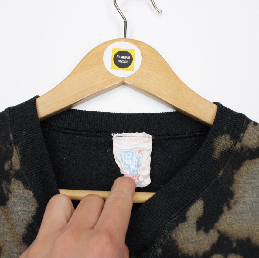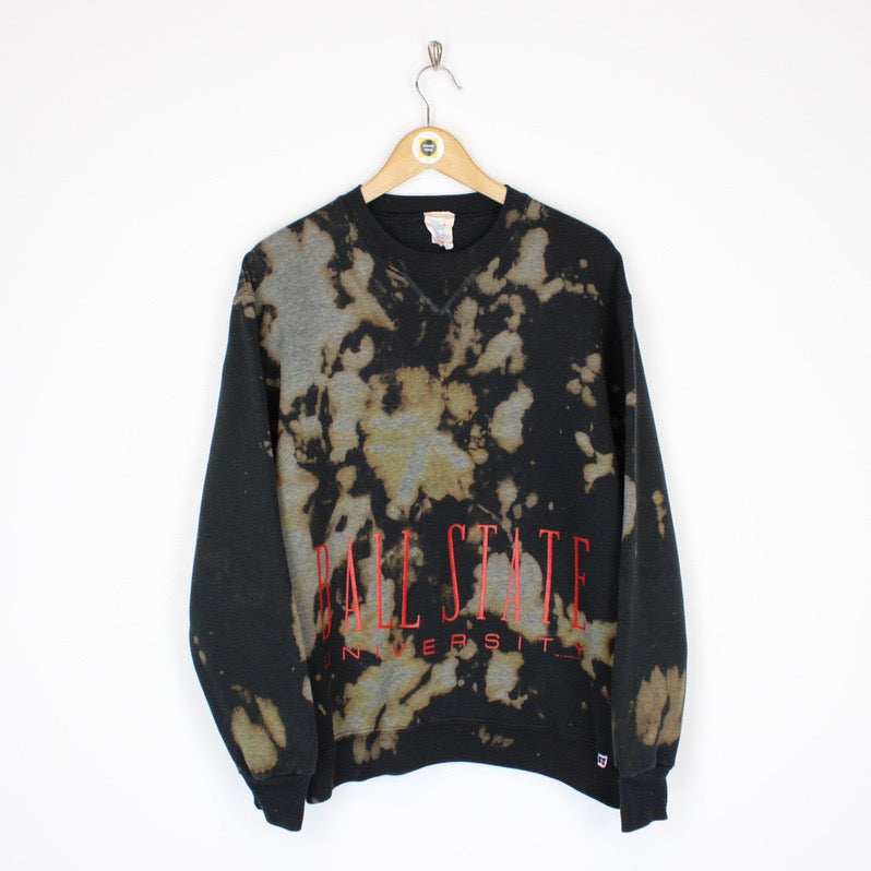 Vintage USA Ballstate University Black Tie Dye Spellout Sweatshirt Jumper - in very good worn condition. Has the printed spellout on the chest - men's size Large, 23 inches pit to pit and 27 inches length