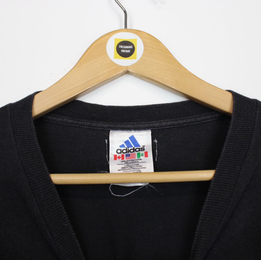 Vintage 90's Adidas Black Crew Neck Spellout Short Sleeve T-Shirt Size on label: Large Our recommended size: Large/XL Pit to pit (inches): 24 Length (inches): 33.5 All products listed are vintage unless stated otherwise in the description. These items are pre-loved and pre-worn, resulting in small signs of wear and fading. We think this adds to their unique authenticity, but if an item has any major flaws these will be stated. Please contact us if you have any further questions!