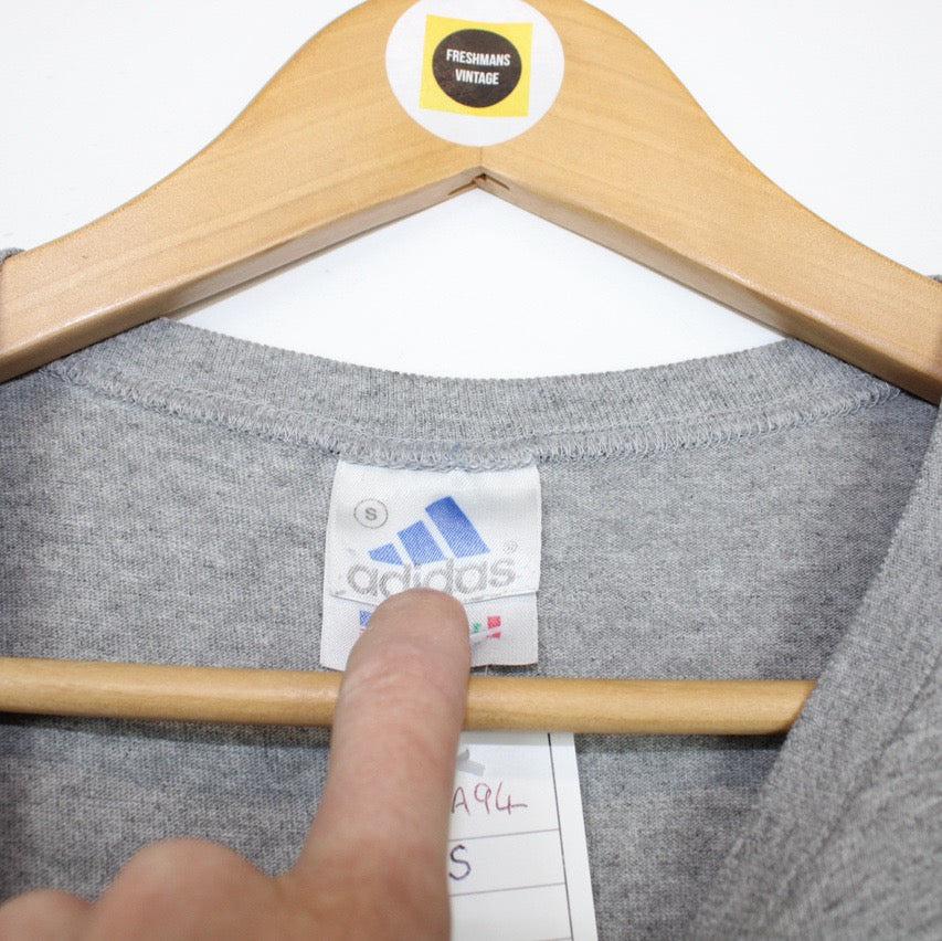 Vintage 90's Adidas Light Grey Crew Neck Short Sleeve Spellout T-Shirt - in good worn condition, only flaw is two tiny pin holes - men's size Small, 20 inches pit to pit and 25 inches length - instant buy is on