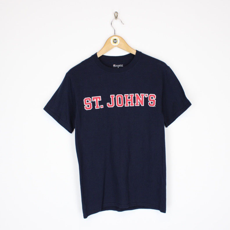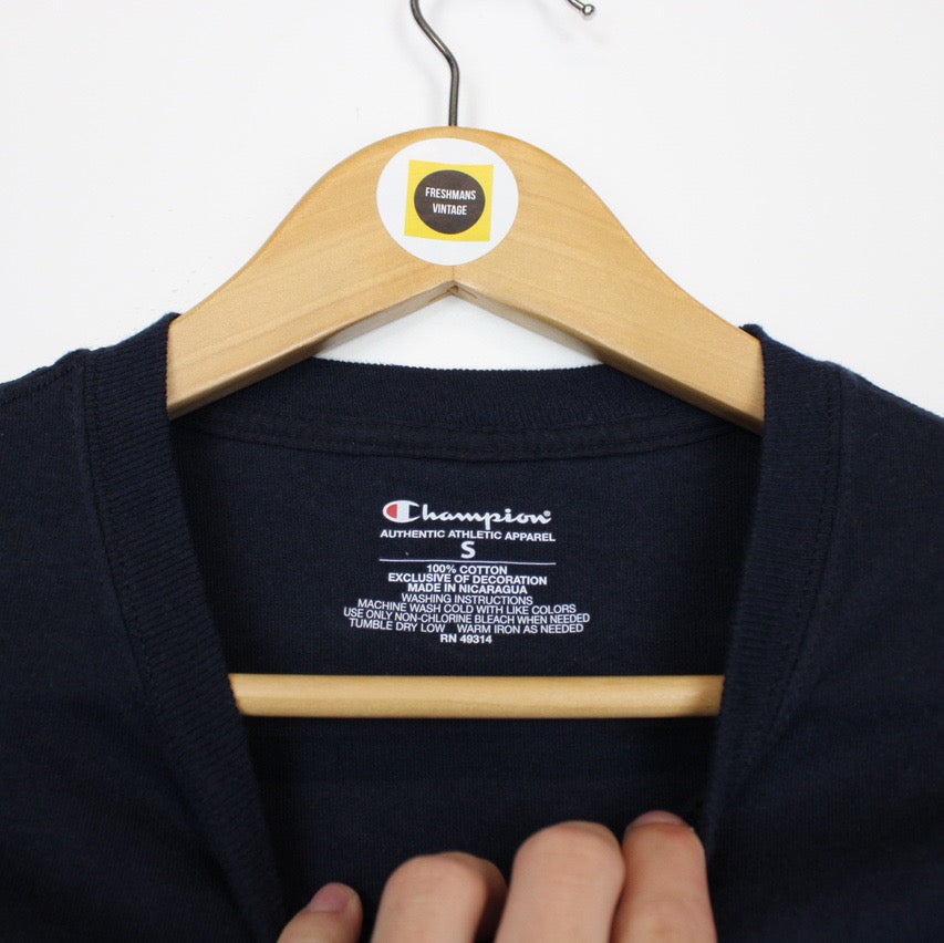 Vintage Champion Navy Blue USA University Crew Neck Short Sleeve T-Shirt - in very good worn condition, has the spellout on the chest and the logo on the arm! - mens size Small, pit to pit measures 17 inches and the length 25 inches