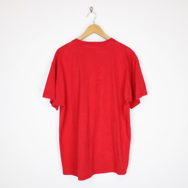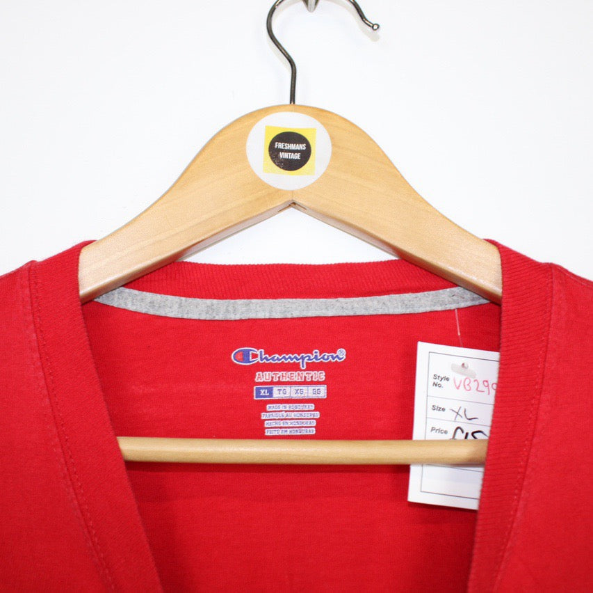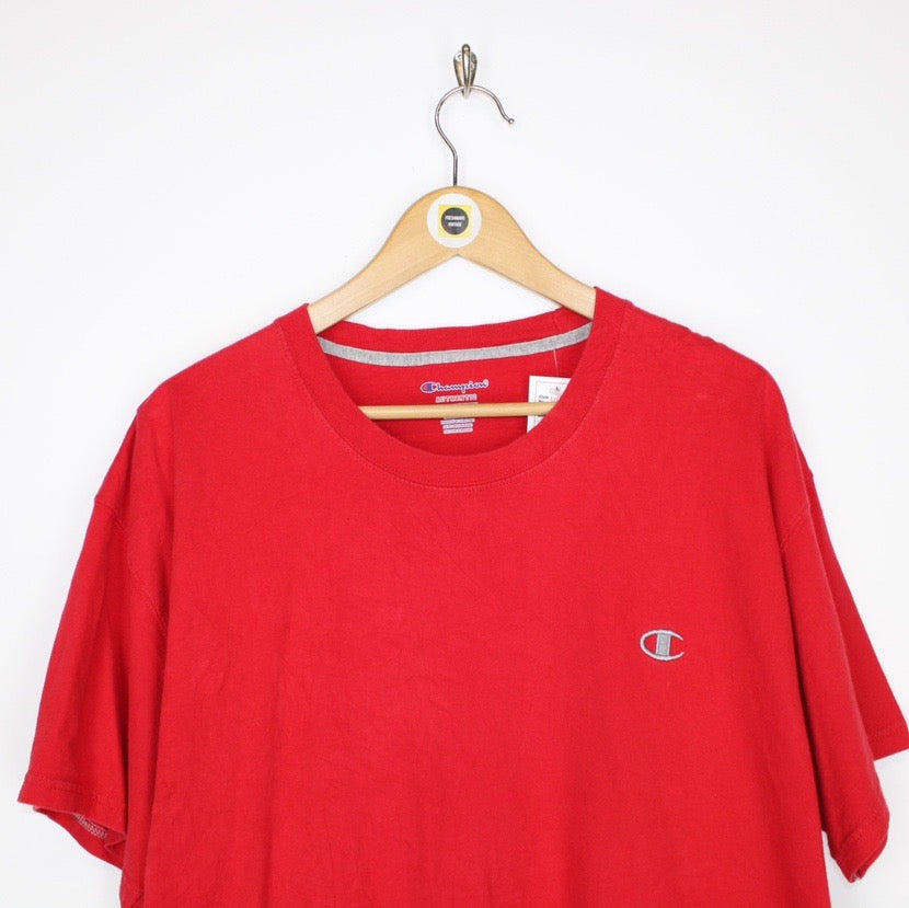 Vintage 90's Champion Red and Silver Crew Neck Short Sleeve T-Shirt - in very good worn condition, has the embroidered logo on the chest - men's size XL, 24 inches pit to pit and 29 inches length