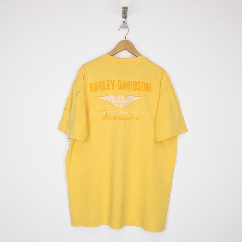 Vintage 90's Harley Davidson Ohio Yellow Short Sleeve Spellout T-Shirt Size on label: N/A Our recommended size: XL Pit to pit (inches): 25 Length (inches): 31 All products listed are vintage unless stated otherwise in the description. These items are pre-loved and pre-worn, resulting in small signs of wear and minor fading. We think this adds to their unique authenticity, but if an item has any major flaws these will be stated below. - The t-shirt has multiple paint marks throughout, this is reflected in the price Please contact us if you have any further questions!