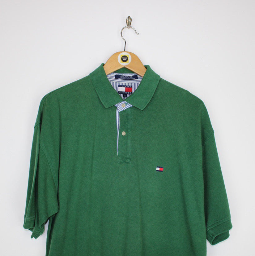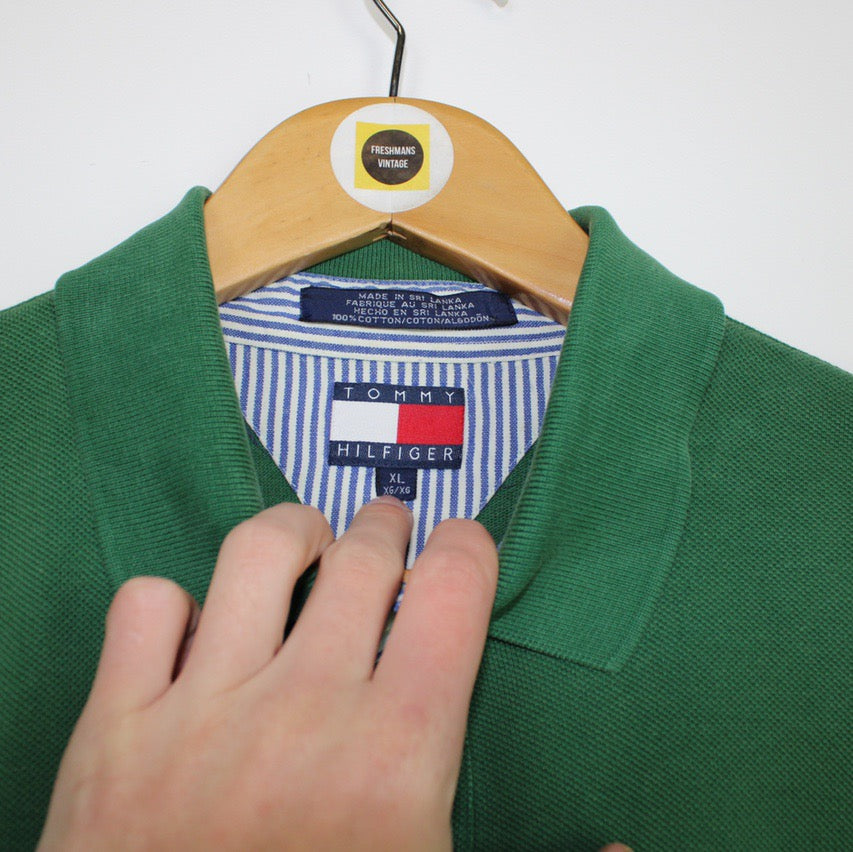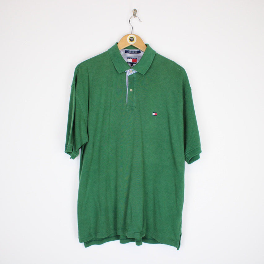 Vintage 90's Tommy Hilfiger Green Short Sleeve Spellout Polo Shirt Size on label: XL Our recommended size: XL Pit to pit (inches): 23 Length (inches): 28 All products listed are vintage unless stated otherwise in the description. These items are pre-loved and pre-worn, resulting in small signs of wear and minor fading. We think this adds to their unique authenticity, but if an item has any major flaws these will be stated below. Please contact us if you have any further questions!