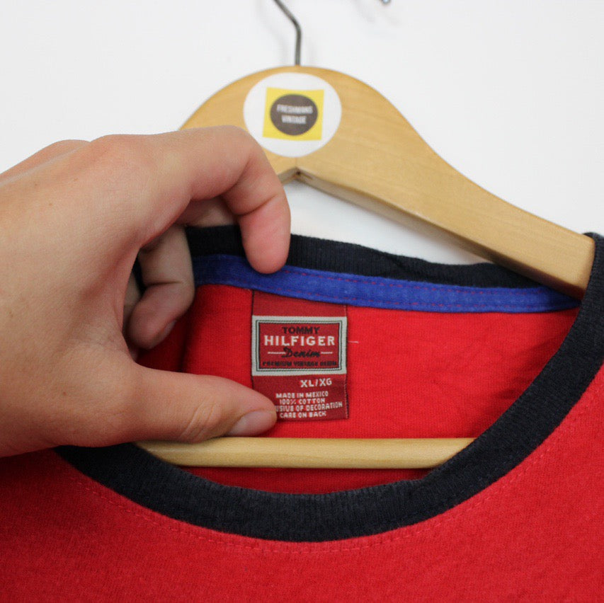 Vintage 00's Tommy Hilfiger Red Crew Neck Short Sleeve Spellout T-Shirt Size on label: XL Our recommended size: Baggy XL Pit to pit (inches): 28 Length (inches): 32 All products listed are vintage unless stated otherwise in the description. These items are pre-loved and pre-worn, resulting in small signs of wear and fading. We think this adds to their unique authenticity, but if an item has any major flaws these will be stated. Please contact us if you have any further questions!